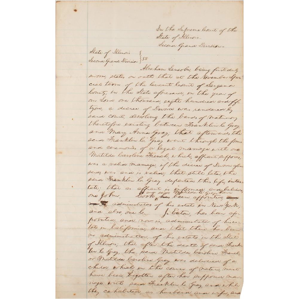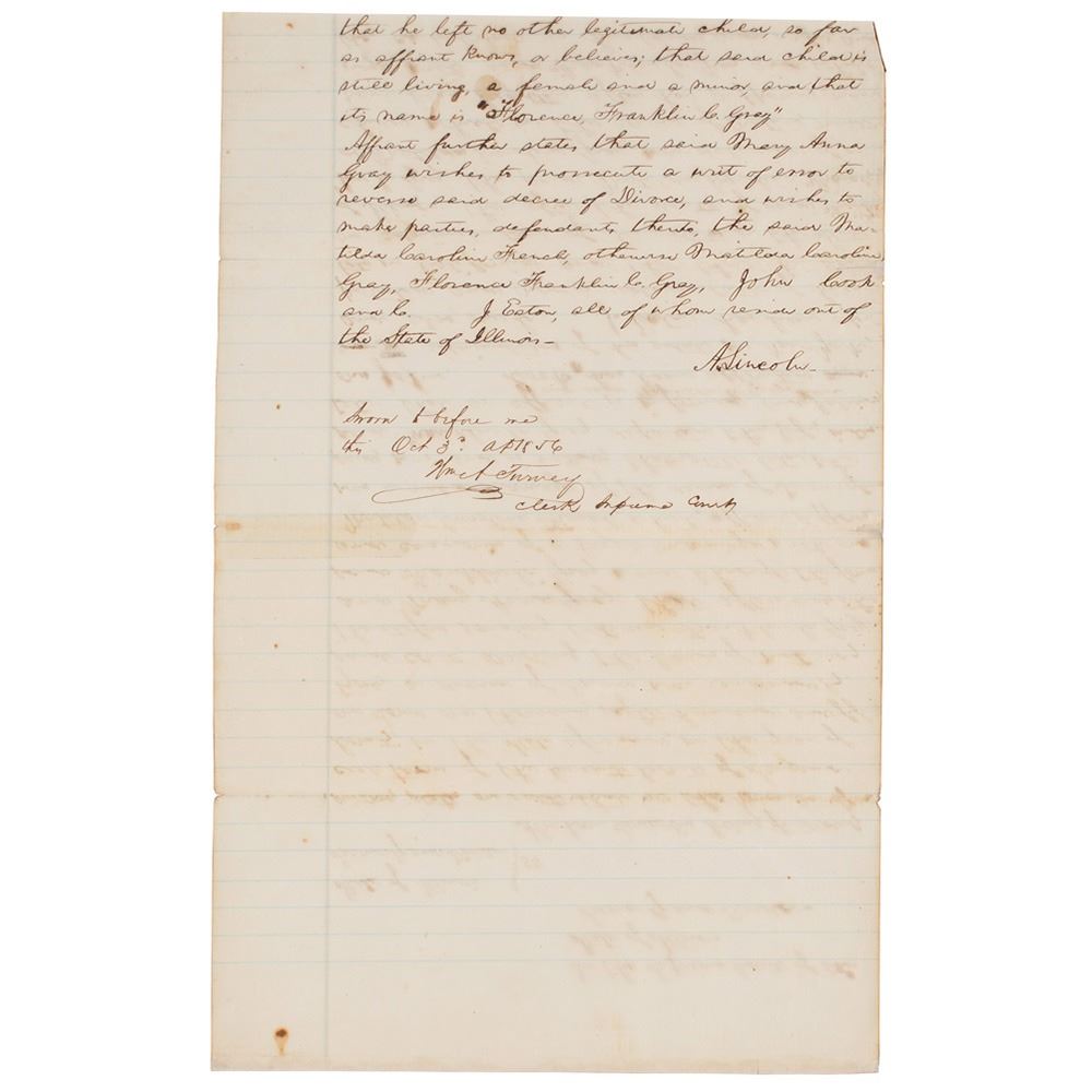 ADS, signed in the third-person, "Abraham Lincoln," and at the conclusion, “A. Lincoln,” one page both sides, 7.75 x 12, October 3, 1856. Lengthy handwritten affidavit by Lincoln, filed with the "Supreme Court of the State of Illinois, Second Grand Division," concerning the disposition of a contested estate. In part: "Abraham Lincoln, being first duly sworn, states on oath that at the November special term of the Circuit Court of Sangamon County, in the State aforesaid, in the year of our Lord one thousand, eight hundred and fifty one, a decree of Divorce was rendered by said court, dissolving the bands of matrimony theretofore existing between Franklin C. Gray and Mary Anna Gray; that afterwards the said Franklin C. Gray went through the forms and ceremonies of a legal marriage with one Matilda Caroline French…after the death of said Franklin C. Gray, the said Matilda Caroline French was delivered of a child, which in the course of nature, must have been begotten after her supposed marriage with Franklin C. Gray, and while they co-habitated, as husband and wife, and that he left no other legitimate child, so far as affiant knows, or believes; that said child is still living, a female and a minor, and that its name is 'Florence Franklin C. Gray.'" Nicely signed at the conclusion by Lincoln, and countersigned by clerk William Turney. Matted and framed with acrylic on both sides to an overall size of 15.5 x 21. In fine condition.