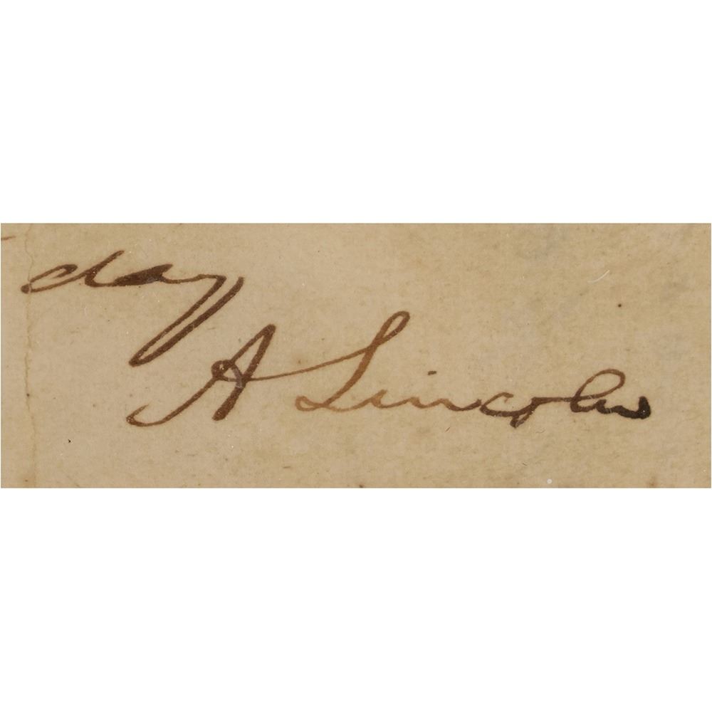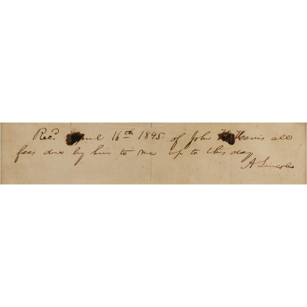 ADS signed “A. Lincoln,†one page, 7.75 x 1.5, April 16, 1845. Handwritten receipt for a payment, in full: "Rec'd April 16th 1845 of John Reavis all fees due by him to me up to this day." Attractively matted and framed with a portrait to an overall size of 16 x 21. In fine condition, with three vertical folds, and possibly repaired unobtrusive tears to the left edge.