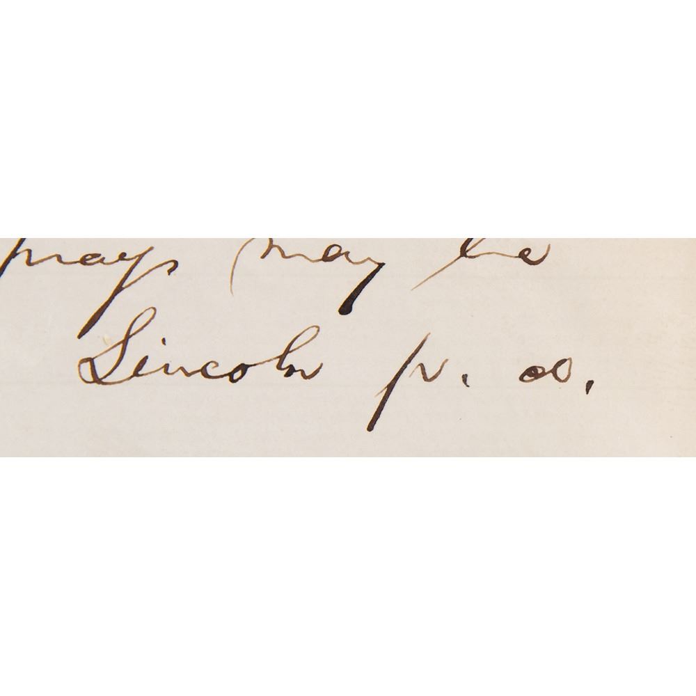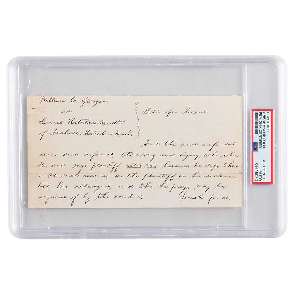 ADS, signed “Lincoln,” one page, 7.75 x 4, no date but circa 1855. Handwritten legal document accomplished entirely in the hand of Abraham Lincoln, in the case of Samuel Hitchcock, administrator of Isabella Hitchcock, v. William C. Glasgow, an action of "debt upon record." In full: "And the said defendant comes and defends, the wrong and injury, when, where &c. and says the plaintiff actio now because he says there is no such record, as the plaintiff in his declaration, has alledged; and this he prays may be enquired of by the court &c." In fine condition, with trimmed edges. Encapsulated in a PSA/DNA authentication holder.