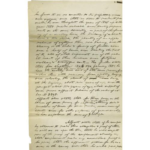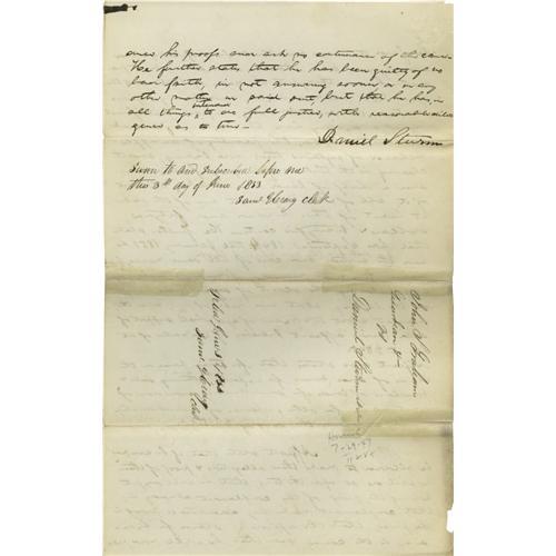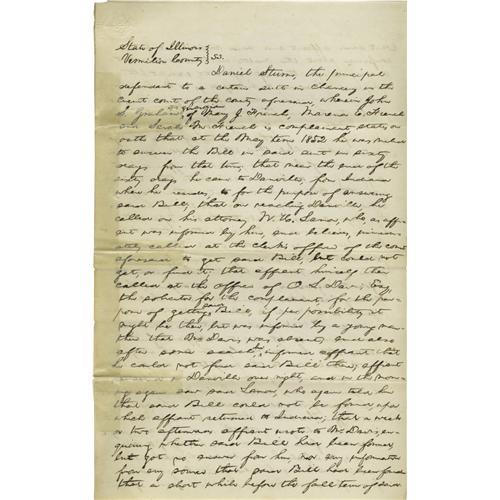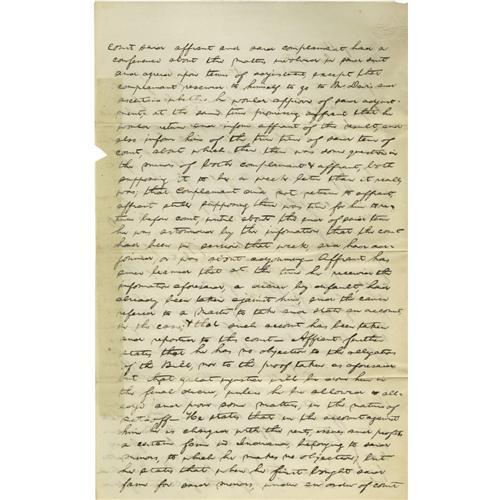 <B>Abraham Lincoln. Autograph Endorsement Signed "And the plaintiff doth the like / Taylor & Lincoln p.q."</B></I> Written at the end of an Autograph Document Signed by N.H. Purple, attorney for the defendant in Betsey Fergusson vs Peter Fleming, Tazewell Co. (Ill.), no date (docketed May 1854), about two and one-quarter pages, folio, on ruled blue paper. An intriguing record from a breach of promise suit. Fleming here claims that his "<I>marriage contract with the said plaintiff</B></I>" was made on the express condition that she would "<I>mmediately leave Scotland & come to the United States</B></I>" when he notified her, but that she "<I>wholly neglected & refused so to do, and did not nor would come to the United States until more than one year after notice and request…</B></I>" Fleming also claims that Betsey, for a <I>"good and valuable consideration",</B></I> had released him from "<I>all his promises and understandings</B></I>"; further, that he had offered to marry her but she had refused. SEE FOLLOWING LOTs From the Henry E. Luhrs Collection.