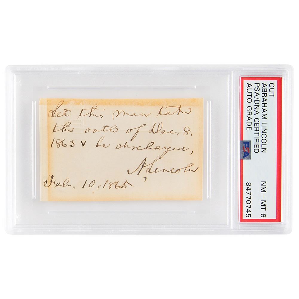 Civil War-dated handwritten endorsement signed as president, "Let this man take the oath of Dec. 8, 1863, & amp; be discharged, A. Lincoln, Feb. 10, 1865," on an off-white 3 x 3.25 slip. In very good to fine condition, with toning from a prior display, and an old tape stain along the top edge. Encapsulated and graded by PSA/DNA as "NM-MT 8."
