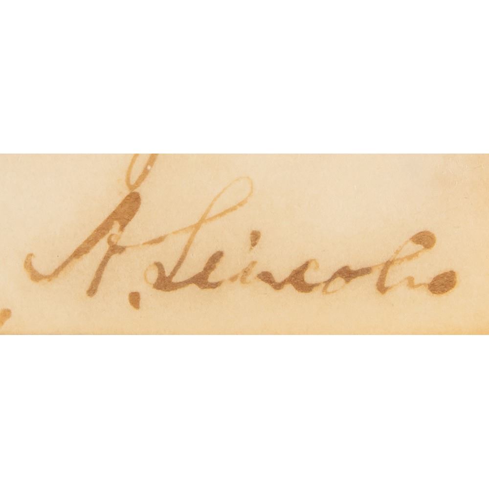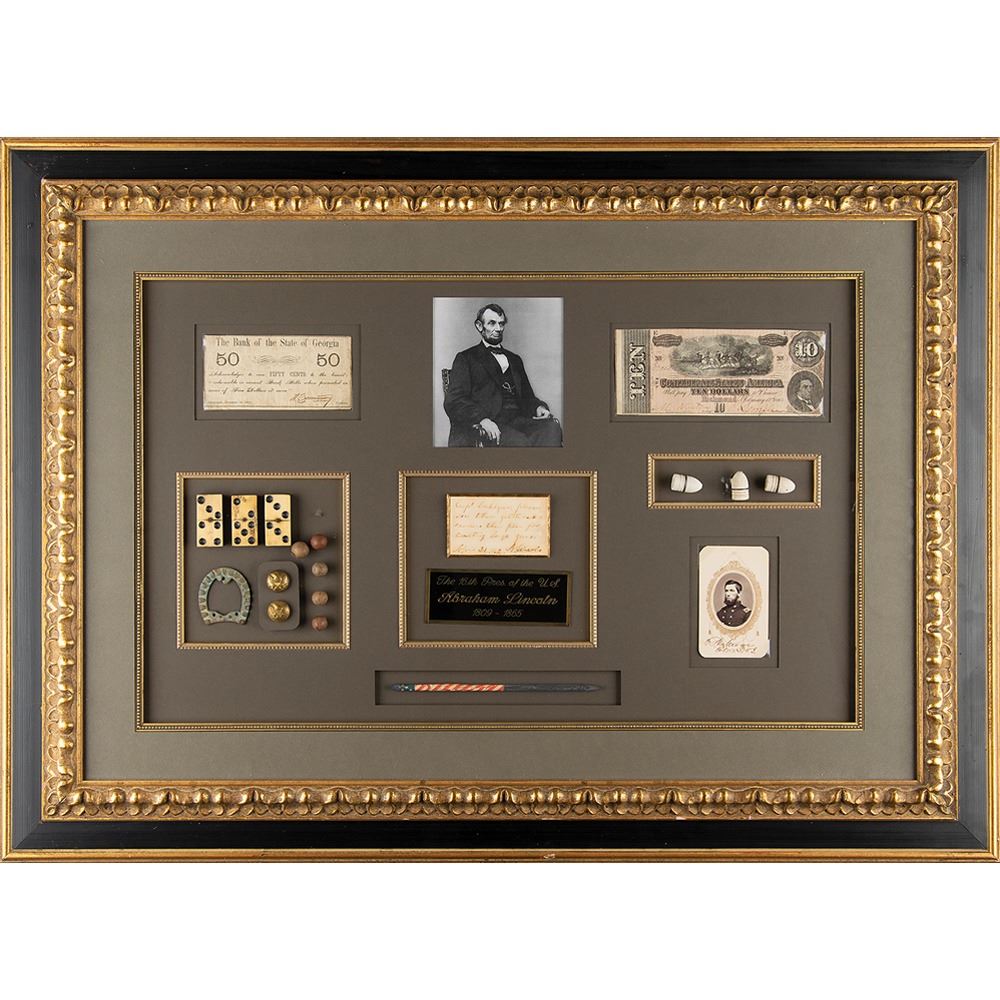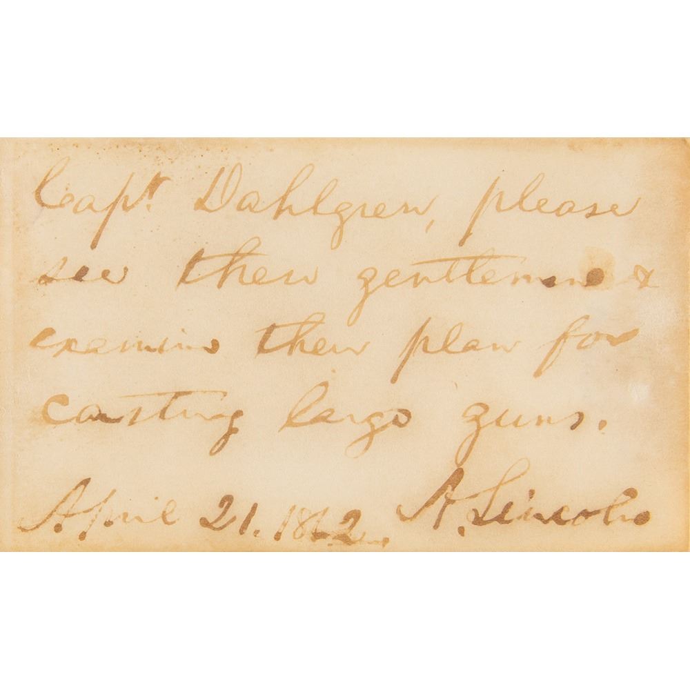 Civil War–dated autograph endorsement signed as president, "Capt. Dahlgren please see these gentlemen & examine their plan for carting large guns. A. Lincoln, April 21, 1862,†on an off-white 3.25 x 2 slip. Impressively mounted, matted, and framed in a 34 x 25 display, which features a number of Civil War-era relics and ephemera, including dominoes, bullets, musket balls, two Confederate bank notes, and a soldier's portrait. In very good to fine condition, with light wrinkling, toning, and fading from prior display; a couple of the bullets have become detached from the mount within the display.