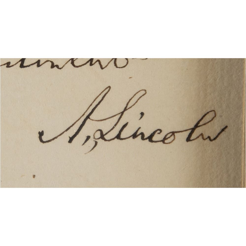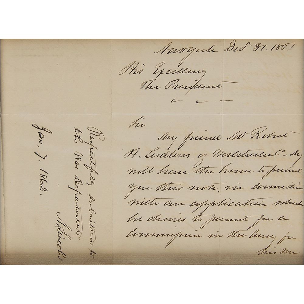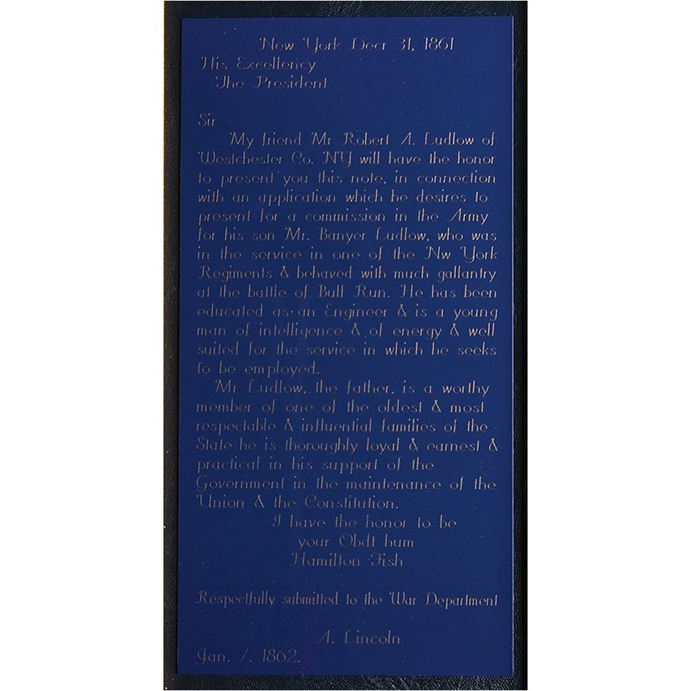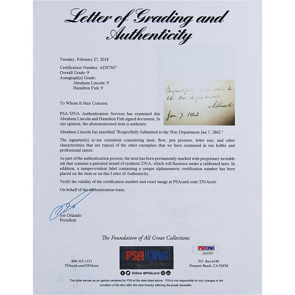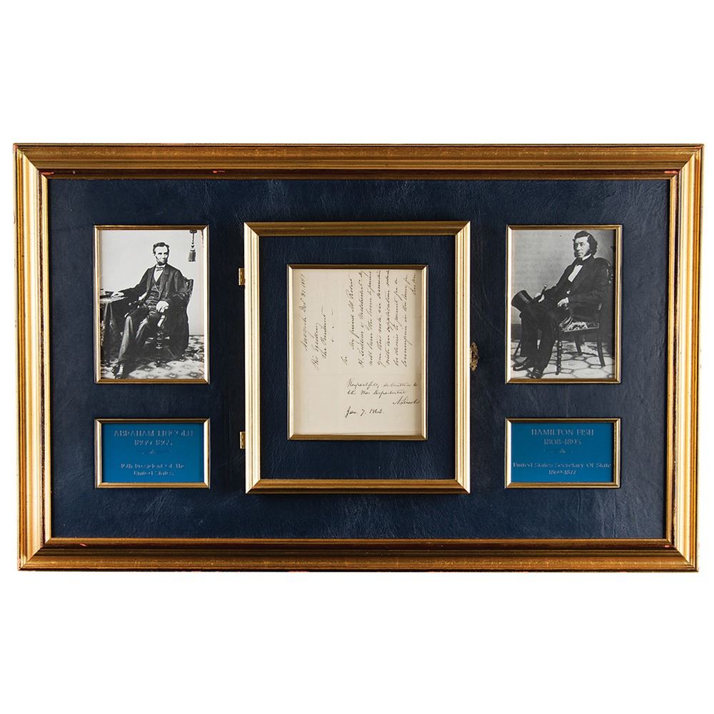 Civil War–dated autograph endorsement signed as president, "Respectfully submitted to the War Department, A. Lincoln, Jan. 7, 1862," penned in the margin of an autograph letter sent to him by New York politician Hamilton Fish, one page both sides, 5.75 x 7.5, December 31, 1861. Fish writes, in full: "My friend Mr. Robert A. Ludlow of Westchester Co., N.Y. will have the honor to present you this note, in connection with an application which he desires to present for a commission in the Army for his son Mr. Banyen Ludlow, who was in the service in one of the New York Regiments & behaved with much gallantry at the battle of Bull Run. He has been educated as an Engineer & is a young man of intelligence & of energy—& well suited for the service in which he seeks to be employed. Mr. Ludlow, the father, is a worthy member of one of the oldest & most respectable & influential families of the State—he is thoroughly loyal & earnest & practical in his support of the Government in the maintenance of the Union & the Constitution." Handsomely matted and framed with glass on both sides, and hinged against a display with portraits of Lincoln and Fish, as well as engraved biographical plaques and a transcript of the letter to an overall size of 31.5 x 19.5. In fine condition. Accompanied by a full letter of authenticity and grading from PSA/DNA, evaluating both autographs as "MINT 9."
