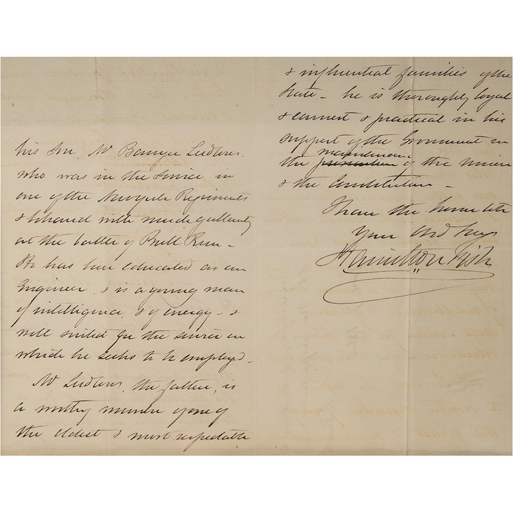 In this important, war-dated letter, Fish recommends a soldier who distinguished himself at the First Battle of Bull Run—the first major battle of the Civil War, fought on July 21, 1861. The fierce fighting and heavy casualties underscored the ideological nature of the conflict, and made both sides realize that the war would be much longer and bloodier than previously anticipated. President Lincoln, surely taking into account Ludlow's battlefield experience and loyal pedigree, respectfully forwards Fish's request to his well-organized War Department, led by Edwin Stanton. A significant Civil War document, imbued with the politics and national pride of the era.