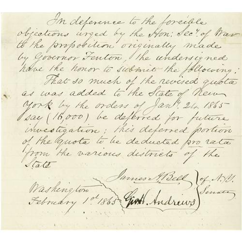<B>Abraham Lincoln Autograph Endorsement Signed</B></I> "<I>A. Lincoln</B></I>", two pages, 7.75" x 6.75", Washington D.C., February 1, 1865 and endorsed by Lincoln the following day. On this endorsement the President instructs Secretary of War Stanton to modify New York's Military Draft Quota in response to a petition by New York senators. New York Senators James A. Bell and George H. Andrews wrote Lincoln asking him to overrule Stanton and "<I>defer for future investigation</B></I>" part of the Jan. 24, 1865 increase in the state's draft quota. Lincoln instructs Stanton to accede to the request unless Stanton saw "<I>some inseparable objection not occurring to me</B></I>". Listed in Basler, Vol. III, p. 257. At the time of publication it was owned by R.E. Bardick of New York. Very fine condition; slight separation along original fold lines and two small tape reinforcements on edges, also slightly trimmed.
