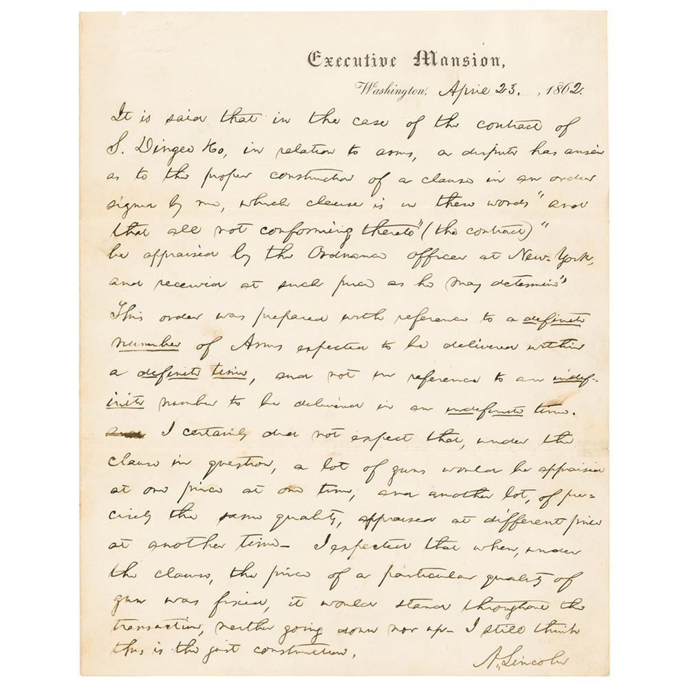 Civil War–dated ALS as president, signed “A. Lincoln,†one page, 8 x 10, Executive Mansion letterhead, April 23, 1862. Handwritten letter by President Lincoln, displaying his sharp legal talents while ensuring that the federal government is not defrauded in the requisition of arms during the Civil War. In full: "It is said that in the case of the contract of S. Dingee & Co., in relation to arms, a dispute has arisen as to the proper construction of a clause in an order signed by me, which clause is in these words 'and that all not conforming thereto' (the contract) 'be appraised by the Ordnance officer at New York, and received at such place as he may determine.' This order was prepared with reference to a definite number of Arms expected to be delivered within a definite time, and not in reference to an indefinite number to be delivered in an indefinite time. I certainly did not expect that, under the clause in question, a lot of guns would be appraised at one price at one time, and another lot, of precisely the same quality, appraised at different prices at another time—I expected that when, under the clause, the price of a particular quality of gun was fixed, it would stand throughout the transaction, neither going down nor up—I still think this is the just construction." In fine condition. Accompanied by a full letter of authenticity and grading from PSA/DNA, evaluating the autograph as a "9."