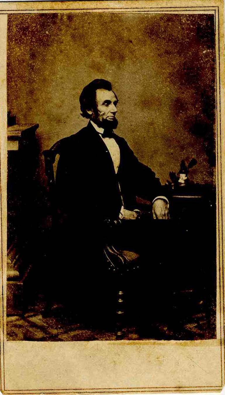 CDV of President Abraham Lincoln from the series of five poses taken at Mathew Brady's Washington gallery on 8 January 1864. Backmarked by E. & H.T. Anthony in New York from a negative by Brady. In very good condition with light discoloration on borders and trimmed lower corners. One of the more rare Lincoln poses.