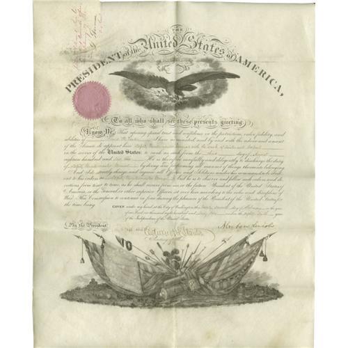 <B>Abraham Lincoln Officer Commission Document Signed.</B></I> One page, 15.75" x 19", on vellum, partly printed, Washington, February 27, 1862. An appointment of David H. Vinton to "Deputy Quartermaster General with the rank of Lieutenant Colonel." David Hammond Vinton was born in Providence, Rhode Island in 1803, and enlisted in 1847 as a major. He was brevetted major general during the Civil War, and retired in 1866. Boldly signed by Lincoln as President at the conclusion, and countersigned by Edwin Stanton as Secretary of War. Fine condition; folds as expected, and a bit of ink transfer near a couple of the folds, seal present and perfect, docketing notes in upper left corner. Service record of Vinton included.