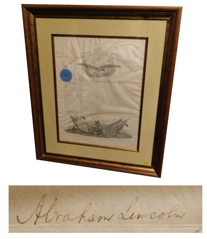 Abraham Lincoln military appointment signed as President, dated 7 July 1864. Countersigned by Secretary of War Edwin M. Stanton. Here, Lincoln appoints a Joseph H. Wilson Assistant Quartermaster of the Volunteers, with the rank of Captain. Includes two ornate motifs at top and bottom of document, with an original blue mounted seal and docketing annotations at top left reading: ''Recorded volume 18 page 24 Lieutenant General's office July 7th 1864'' signed ''Ed Townsend Asst. Adjt. General''. Document measures 14.5'' x 19'', with minor wrinkling throughout, and is nicely framed to an overall size of 23.5'' x 28''. Signed clearly ''Abraham Lincoln''. Near fine.