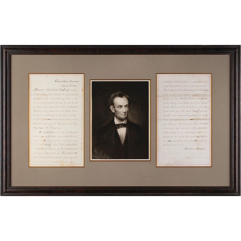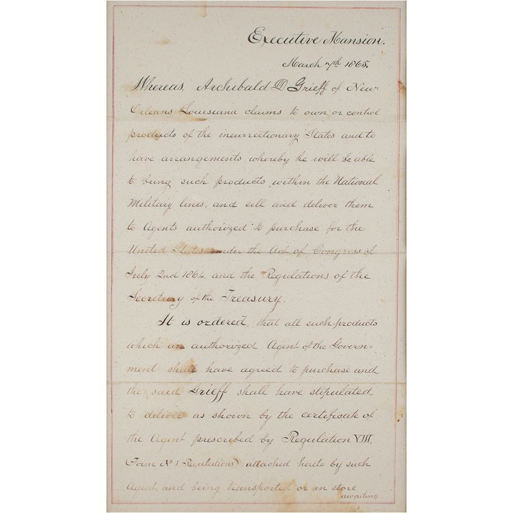 Important manuscript DS as president, two pages, 7.75 x 13.25, March 7, 1865. Significant document issued from the Executive Mansion, permitting trade across military lines during the Civil War. In part: "Where Archibald D. Grieff of New Orleans, Louisiana, claims to own or control products of the insurrectionary states and to have arrangements whereby he will be able to bring such products within the national military lines, and sell and deliver them to agents authorized to purchase for the United States under the act of Congress of July 2, 1864, and the regulations of the Secretary of the Treasury; It is ordered that all such products which an authorized agent of the government shall have agreed to purchase and the said Grieff shall have stipulated to deliver as shown by the certificate of the agent prescribed by Regulation VIII…