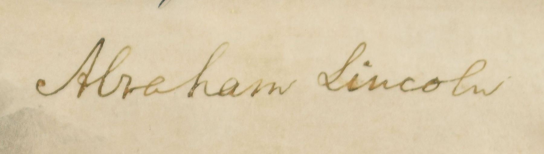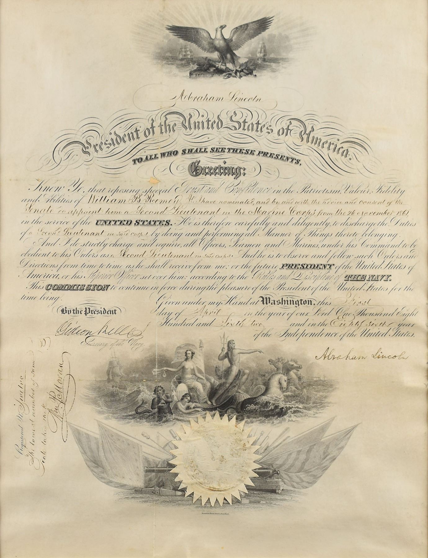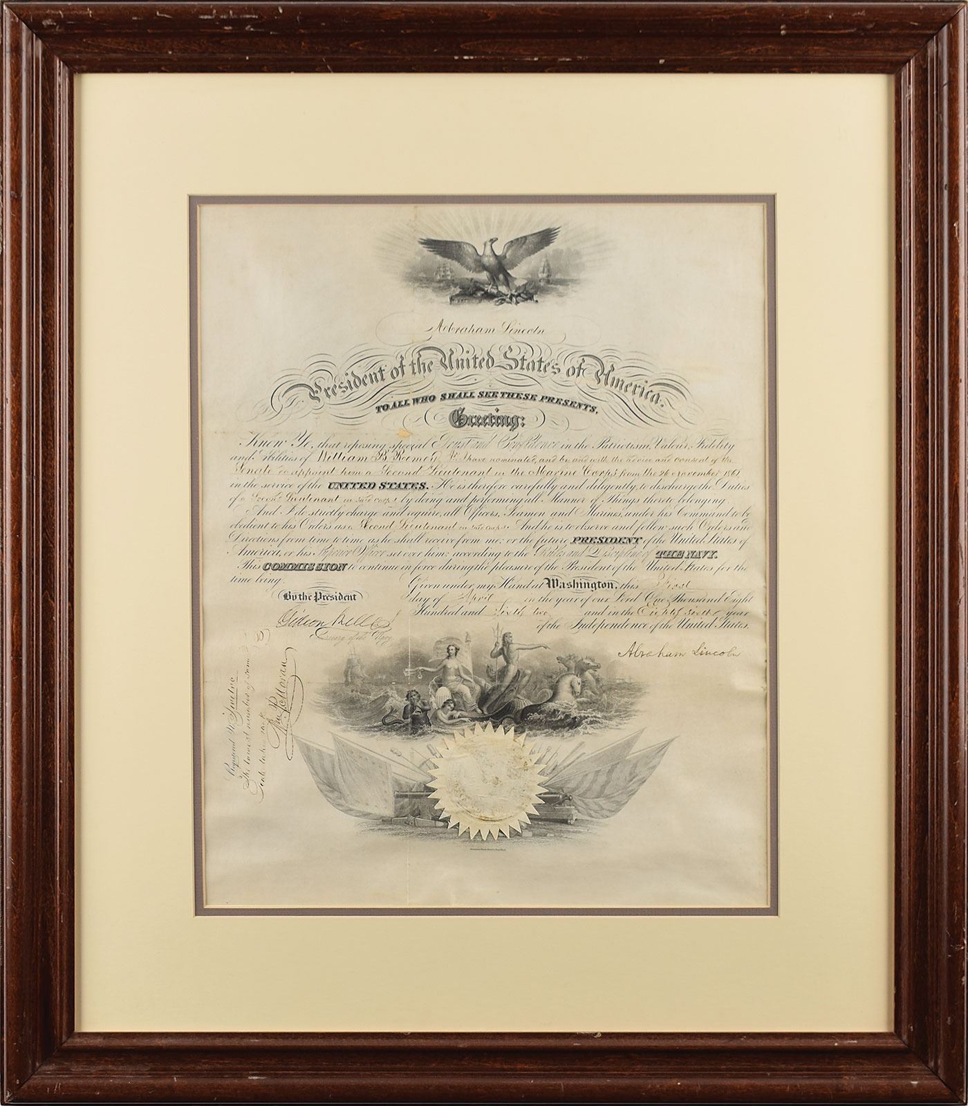 Partly-printed vellum DS as president, one page, 14.25 x 17.75, April 1, 1862. President Lincoln appoints William B. Remey, Jr. as "Second Lieutenant in the Marine Corps." Boldly signed at the conclusion by President Lincoln and countersigned by Secretary of the Navy Gideon Welles. The white seal affixed at the bottom remains fully intact. Handsomely double-matted and framed to an overall size of 24.75 x 28. In fine condition, with one small area of loss to the left of the printed "Greeting" at the top.
