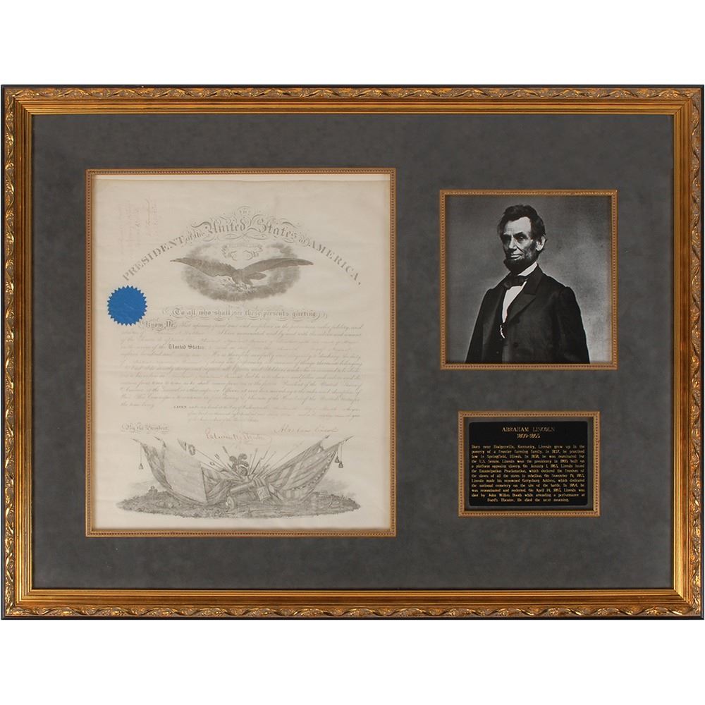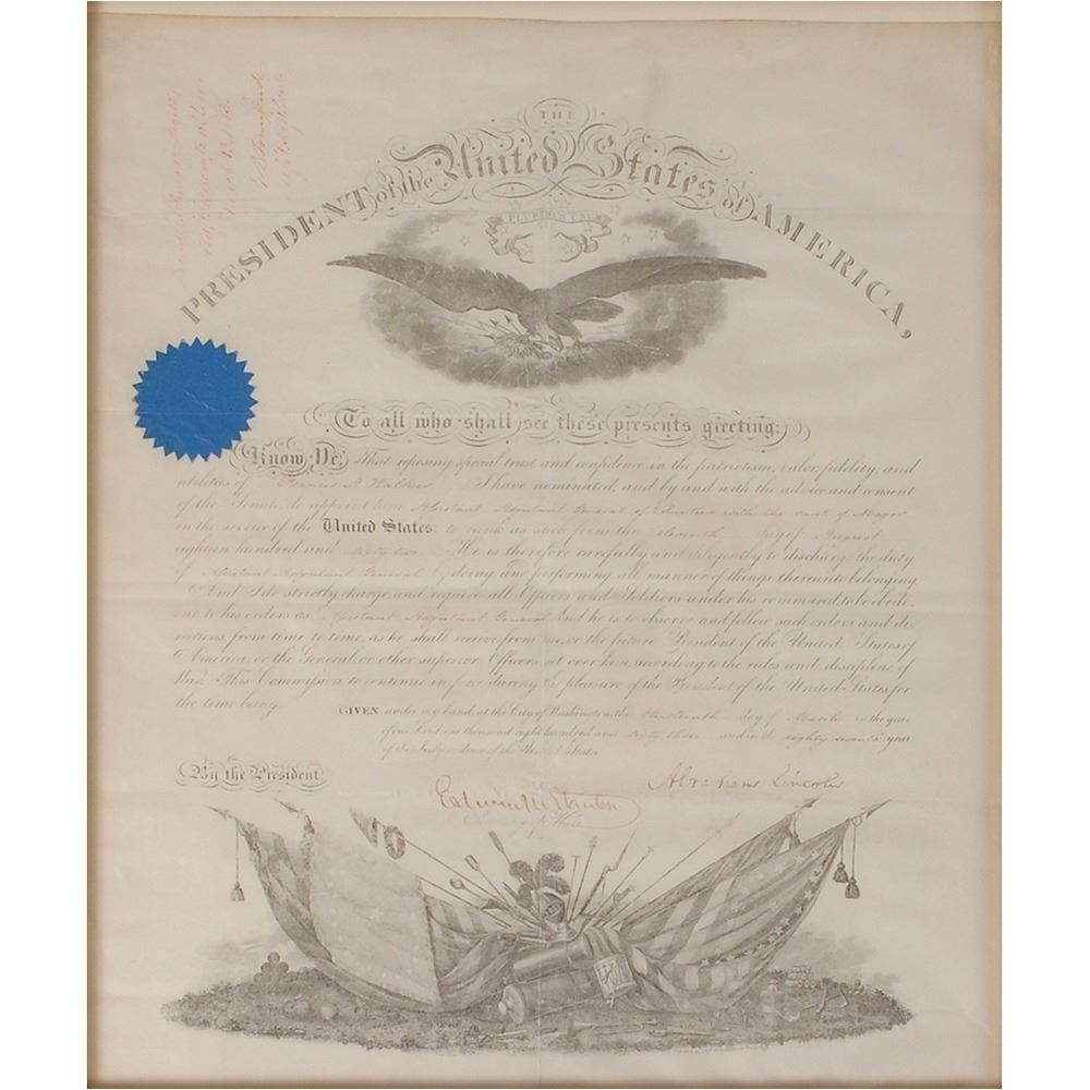 Civil War-dated DS as president, one page, 15 x 18, March 13, 1863. President Lincoln appoints Francis A. Walker as "Assistant Adjutant General of Volunteers with the rank of Major." Signed at the conclusion by Lincoln, and countersigned by Secretary of War Edwin Stanton. Blue seal affixed to left side remains intact. Beautifully suede-matted and framed with a portrait of Lincoln and a biographical plaque to an overall size of 36 x 27.25. In fine condition.