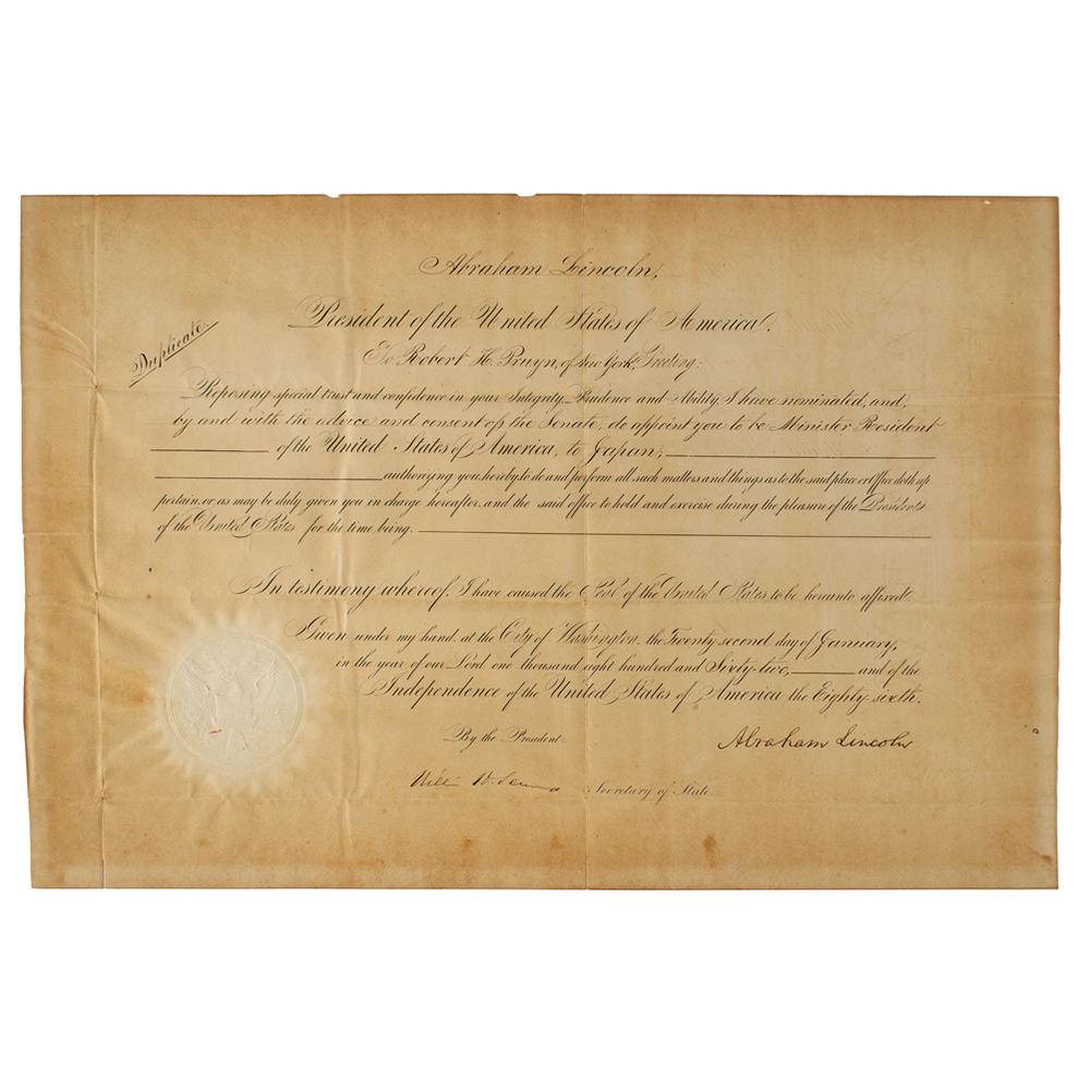 Civil War-dated partly printed DS as president, one page, 17.75 x 12, January 22, 1862. President Lincoln appoints Robert H. Pruyn of New York to be "Minister Resident of the United States of America, to Japan." Signed crisply at the conclusion by Abraham Lincoln, and countersigned by Secretary of State William H. Seward. The lower left is embossed with the State Department seal, and the upper left is marked "Duplicate." In very good condition, with somewhat irregular overall toning, and splitting along some of the multiple intersecting folds.