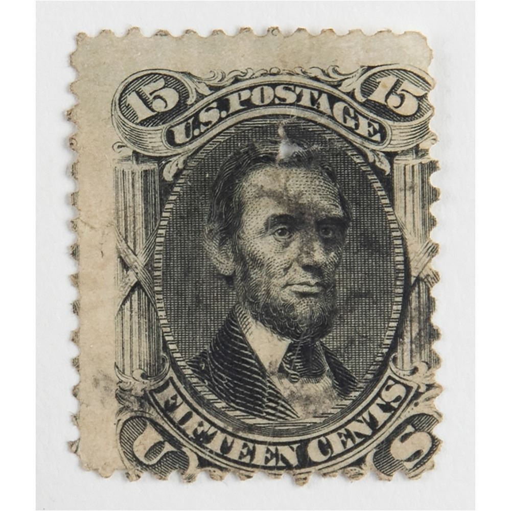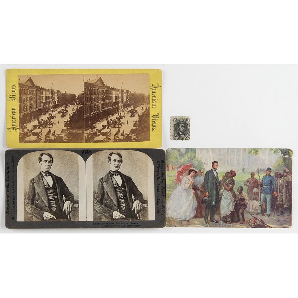 Four pieces of ephemera, highlighted by the first US mourning stamp honoring the late President Abraham Lincoln—a 15-cent postage stamp issued in 1866, featuring a black portrait of Lincoln. Additionally includes: a Keystone stereoview of the earliest known photograph of Abraham Lincoln at age 39; an 'American Views' stereoview of New York City decorated for Lincoln's funeral; and a color postcard with an allegorical illustration showing President Lincoln meeting with freed slaves at the White House. In very good to fine condition, with the stamp canceled and with a small hole above his head; and heavy creasing to the postcard.