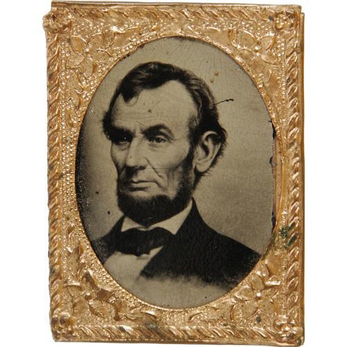 <B>Abraham Lincoln Gem Tintype.</B></I> An excellent .75" x 1" hard image with brass frame. Two minor scratches in field not affecting the portrait which has bold deep tonal contrasts. The frame has two small stains on the face and is missing one of the vertical flaps on the verso. Overall fine condition.<BR><BR><b>Shipping:</b> Miscellaneous Collectibles, Smal (<a target="_blank" href="http://www.heritageauctions.com/common/shipping.php">view shipping information</a>) <BR><BR><B>Important notice