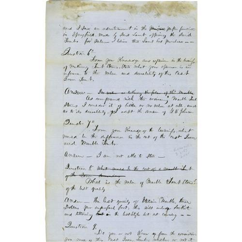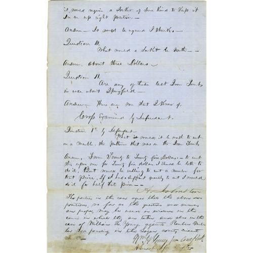 <B>Abraham Lincoln. Lengthy Autograph Endorsement Signed "A. Lincoln for Defts." </B></I> No place or date (probably Sangamon Co., Ill., ca 1855), two pages, folio, on blue paper. The main text, in an unknown hand, is signed by A. Johnston and comprises the last page of a once-longer deposition in a lawsuit involving cast iron tombs. Johnston, who was a prominent Springfield monument-maker, unsurprisingly declares that "compared with…ordinary marble tombstones" the cast-iron kind are "of little or no value" and although he dodges a question as to their difference in cost, he does admit that the best quality of tombstone, Italian marble, would cost $3 "per superficial foot" including "socket and lettering in the best style but not carving." Asked if any cast iron tombs are "in use about Springfield" he replies "none that I know of." At the foot of the document, Lincoln has penned a statement that: <I>"The parties in this case agree that the above depositions, so far as the questions and answers are proper, may be used in evidence in the cause…and also in the case of William H. Young against Reuben Miller now pending in the Logan county circuit court."</B></I> Interestingly it was Johnston who repaired Lincoln's sarcophagus when it was damaged in an 1876 attempt to steal the President's remains. Brownish staining nearly blots out the final word in Lincoln's endorsement ("court") and covers his signature, which nevertheless is quite readable. From the Henry E. Luhrs Collection.