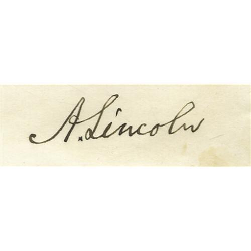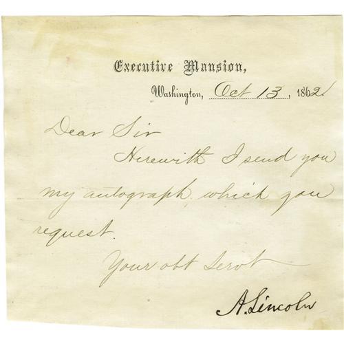 <B>Abraham Lincoln Letter Signed as President</B></I> L.S. <I>"A. Lincoln"</B></I> on Executive Mansion letterhead, 1p., trimmed to 5" x 4.5", Washington , Oct. 13, 1862. A brief signed letter granting a request for his autograph: "Dear Sir Herewith I send you my autograph..." Very clean, save a few mounting remnants on verso; and excellent example of his Presidential signature.<BR><BR><b>Shipping:</b> Flat Material, Small (<a target="_blank" href="http://www.heritageauctions.com/common/shipping.php">view shipping information</a>)