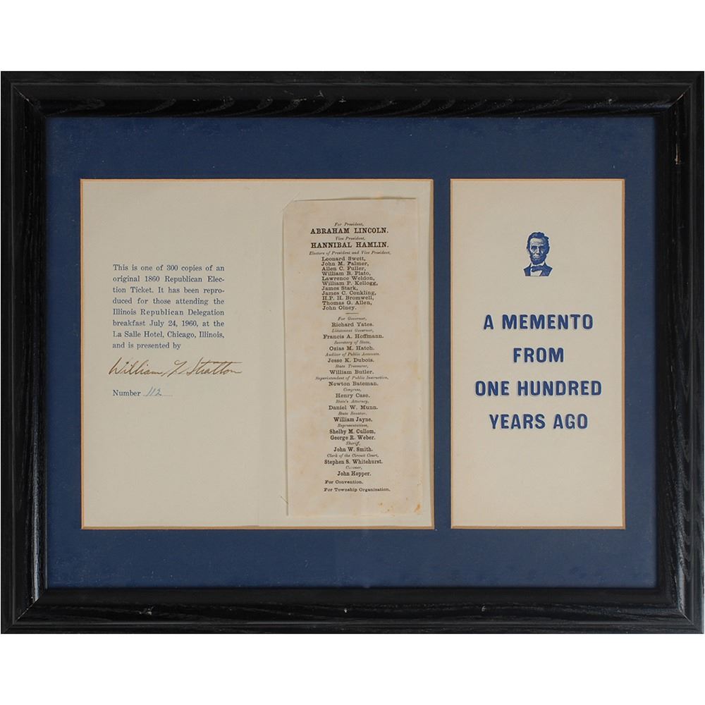 Limited edition facsimile of an 1860 Republican Election ticket, 3 x 7, listing Abraham Lincoln for president and Hannibal Hamlin as vice president. Includes a presentation sheet entitled "A Memento from One Hundred Years Ago," numbered 112/300, and signed by William Stratton, reading, in part: "This is one of 300 copies…for those attending the Illinois Republican Delegation breakfast July 24, 1960." Framed and in fine condition.