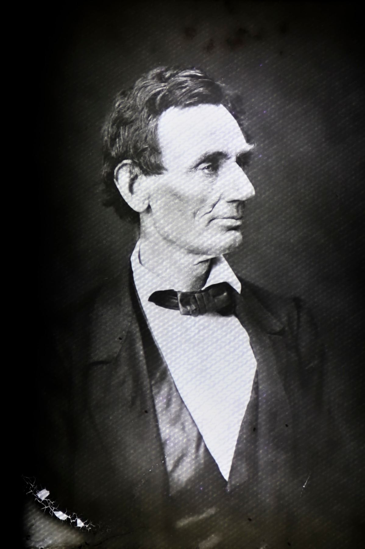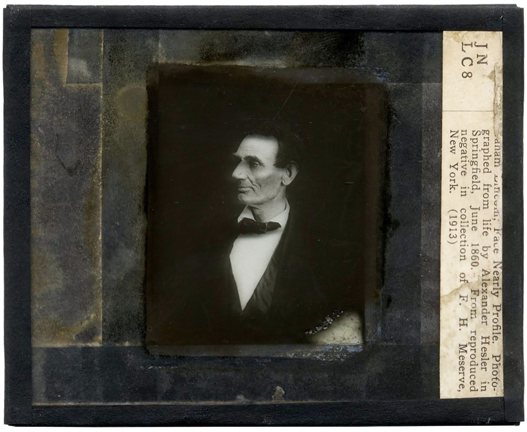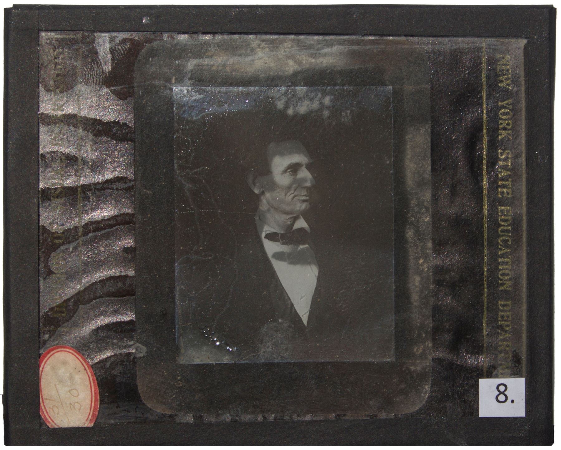 Abraham Lincoln magic lantern slide, picturing Abraham Lincoln on 3 June 1860 after earning the nomination for President a few weeks prior. Of this photograph taken by Alexander Hesler, Lincoln's law partner William Herndon said of it: ''There is the peculiar curve of the lower lip, the lone mole on the right cheek, and a pose of the head so essentially Lincolnian; no other artist has ever caught it.'' Glass slide is from the New York State Education Department, reproduced from the negative owned by Frederick Meserve. Slide measures 4'' x 3.25''. In very good condition with excellent photographic quality.