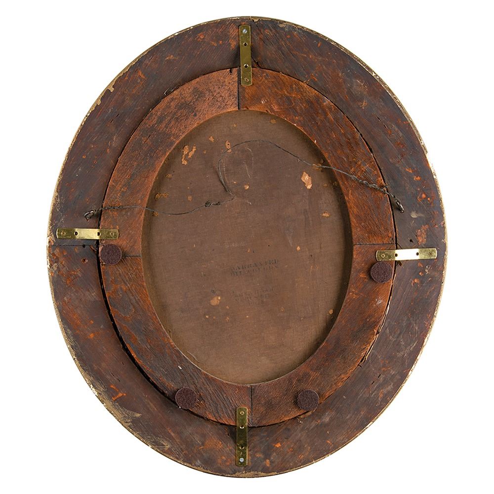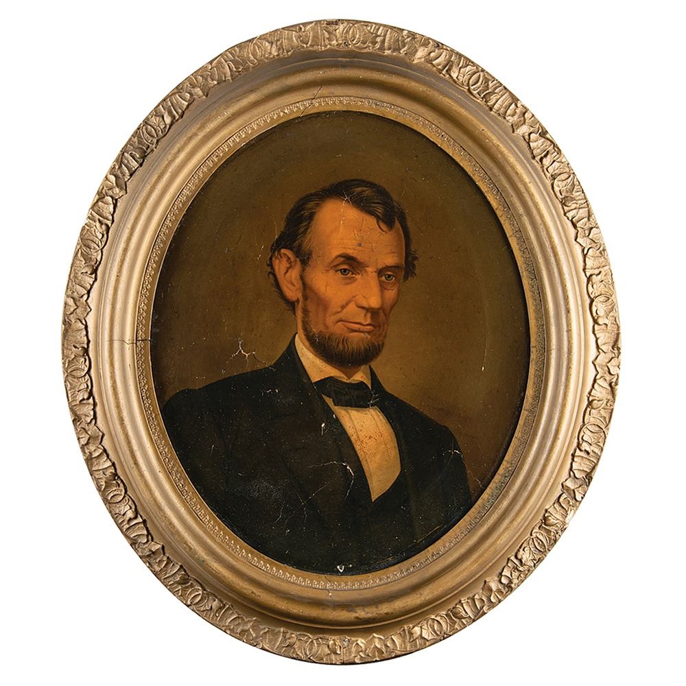 Impressive oval chromolithograph print of Abraham Lincoln backed by canvas, 13 x 16, featuring a handsome portrait of the president in a bust-length pose. The canvas backing is stamped "Warranted Oil Colors." Ornately framed to an overall size of 19 x 22. In good to very good condition, with cracks and crazing to the surface of the print, a few cracks and minor losses to the frame, and some scattered soiling.