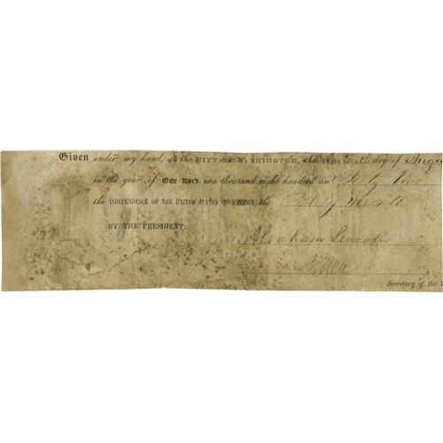 <B> Abraham Lincoln Partial Document Signed </B></I> "<I>Abraham Lincoln.</B></I>" 9" x 2.8", dated August 19, 1862. The signature is located in the lower portion of the remaining document. Staining and soiling are significant; however, the signature is still visible.****