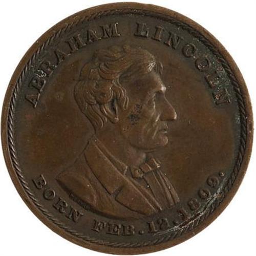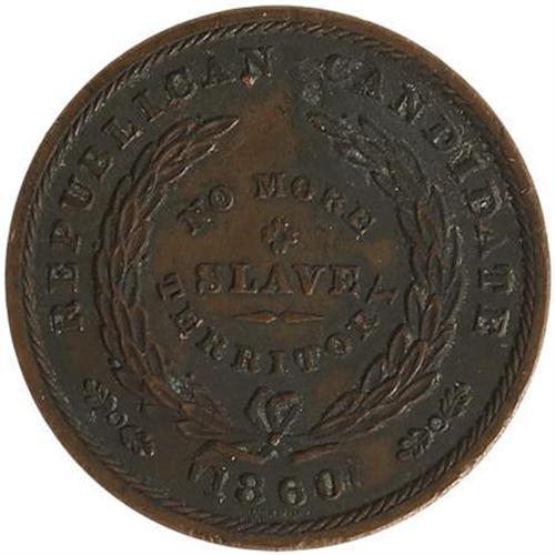 <B>Abraham Lincoln "Republican Candidate" Token by Merriam.</B></I> 31mm, Sullivan- DeWitt AL 1860-38, in copper. Inscription around the portrait on the obverse reads "Abraham Lincoln Born Feb. 12,1809". On the reverse the medal reads "Republican Candidate" enclosing the central slogan " No More/Slave/ Territory".Condition is choice.<BR><BR><b>Shipping:</b> Miscellaneous Collectibles, Smal (<a target="_blank" href="http://www.heritageauctions.com/common/shipping.php">view shipping information</a>)