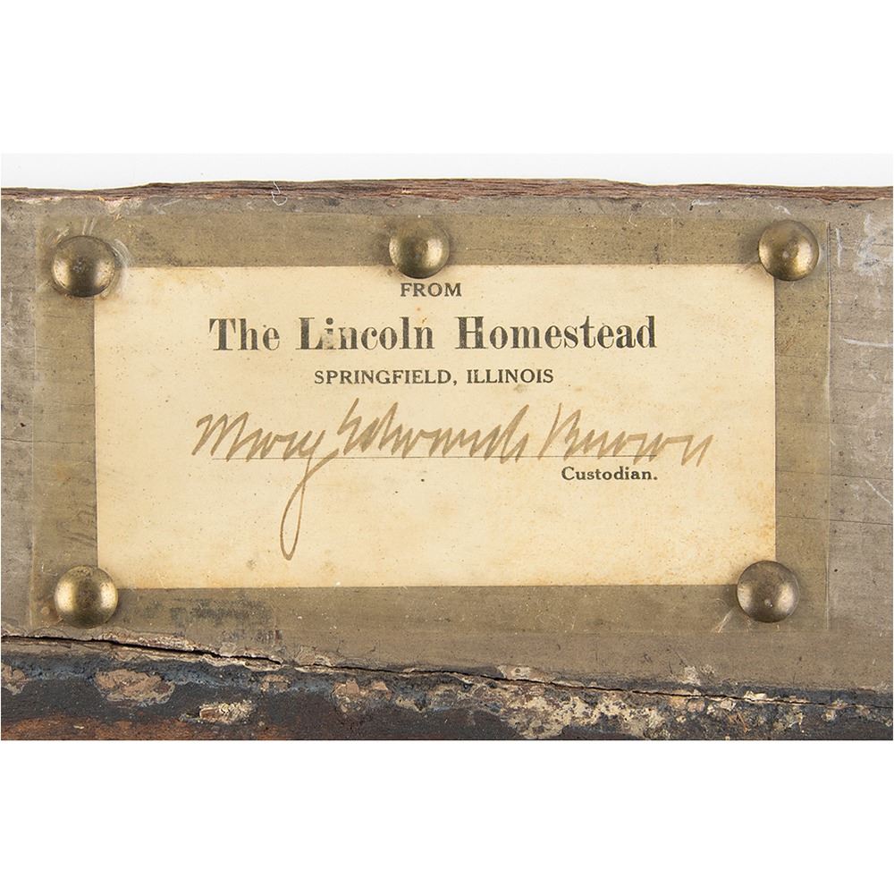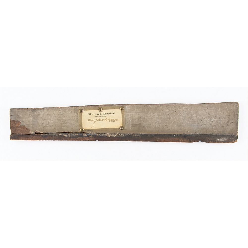 Section of wooden siding from the Lincoln Homestead in Springfield, Illinois, measuring approximately 19" x 3.5"Â x .5", with an affixed attribution label, "From The Lincoln Homestead, Springfield, Illinois," signed in ink by the home's custodian, Mary Edwards Brown, the grandniece of Mary Todd Lincoln. Also includes a scarce 3 x 2.25 trimmed carte-de-visite photograph of Abraham Lincoln with his son, Tad, standing outside of their Springfield home, originally taken by J. A. Whipple in the summer of 1860. The photograph is mounted to a larger sheet, identified below in ink: "President Lincoln Residence, Springfield, Ill." In overall very good to fine condition. A remarkable pairing of Lincoln pieces associated with his pre-presidential life in Springfield, Illinois, where he got his start as a lawyer and politician.