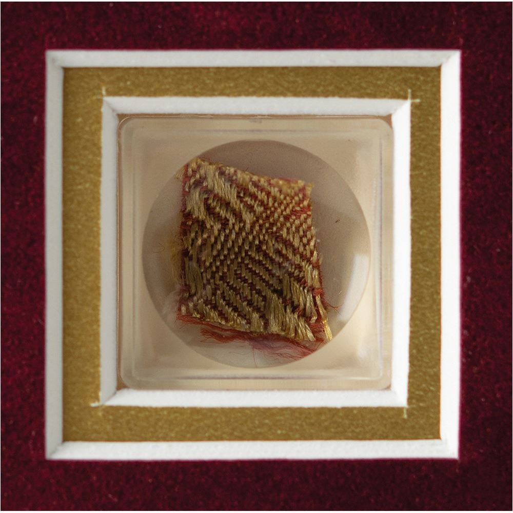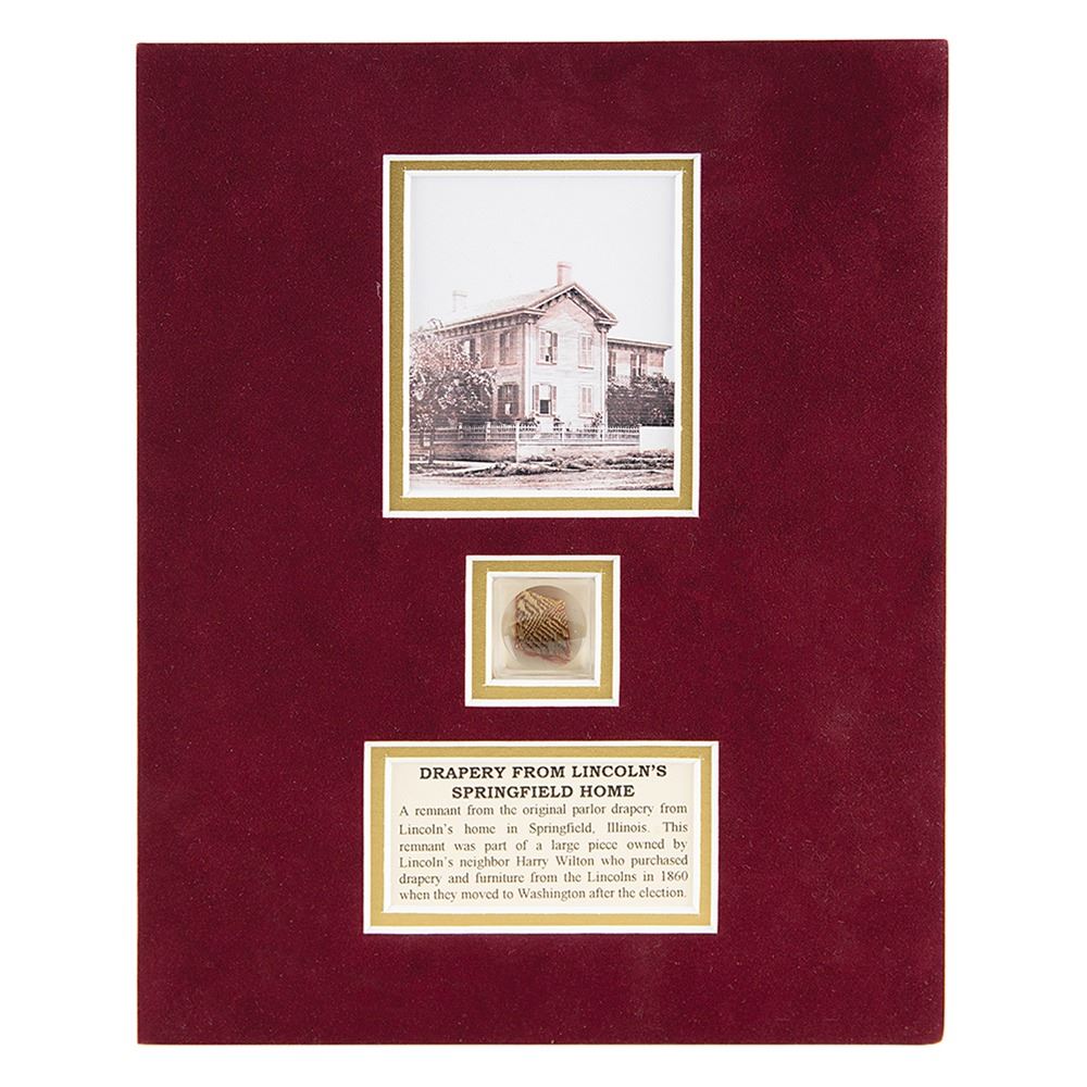 Swatch of drapery fabric attributed to Abraham Lincoln's home in Springfield, Illinois, displayed under a magnifying lens and double-matted with a caption and image to an overall size of 8 x 10. The caption reads: "A remnant from the original parlor drapery from Lincoln's home in Springfield, Illinois. This remnant was part of a large piece owned by Lincoln's neighbor Harry Wilton who purchased drapery and furniture from the Lincolns in 1860 when they moved to Washington after the election." In fine condition.