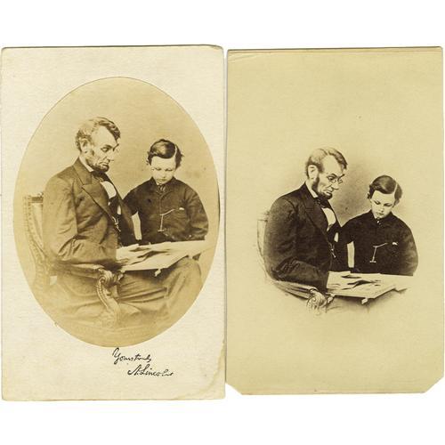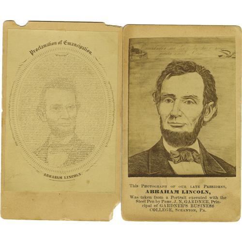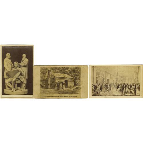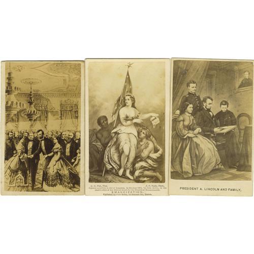 <B>Abraham Lincoln: Ten Varied <I>Cartes de Visite</B></I></B></I> <B>of the Civil War Era.</B></I> <BR>--Two images of Lincoln and Thad, one bearing the imprint of Charles Desilver, Philadelphia. <BR>--An unusual image of "Our Late President", a steel pen copy of the familiar Berger pose issued as a promotional item for Gardner's Business college, Scranton PA, with their promotional text on reverse. <BR>--A ghost image of Lincoln on the Emancipation Proclamation. Reverse bears a tribute poem by the issuer, George Martin, Montreal. <BR>--An image of the familiar engraving of Lincoln with his family. No maker imprint. <BR>--An attractive image titled "Emancipation" showing Mr. Liberty with African American man and woman. By John Sowle, Boston. No maker's name. <BR>--Two artists conceptions of Lincoln's inaugural ball, both with Abe front and center. No maker's name. <BR>--An artist's conception of "President Lincoln's First Home" by Crater and published by J.I. Campbell, Chicago. Historic text on verso. <BR>--A beautiful image of the acclaimed Roger's "Council of War" sculpture, issued by Edouart's Photographic Gallery, San Francisco. <BR>Overall condition excellent, one with three border chips and one with two corner clips. Approximate size: 2.5" x 4".<BR><BR><b>Shipping:</b> Small Flat (<a target="_blank" href="http://www.heritageauctions.com/common/shipping.php">view shipping information</a>)