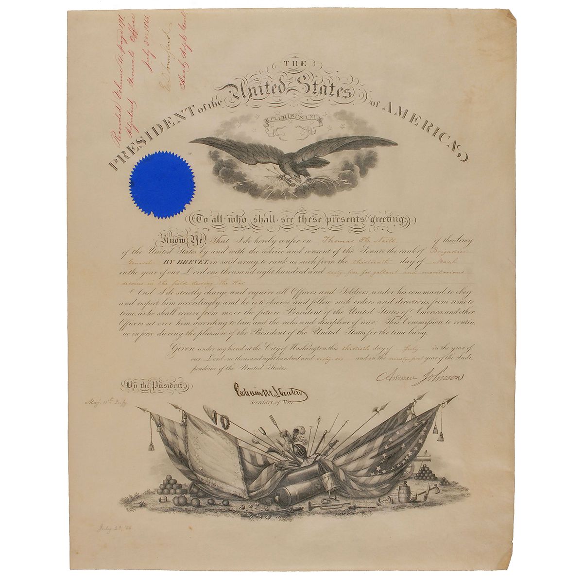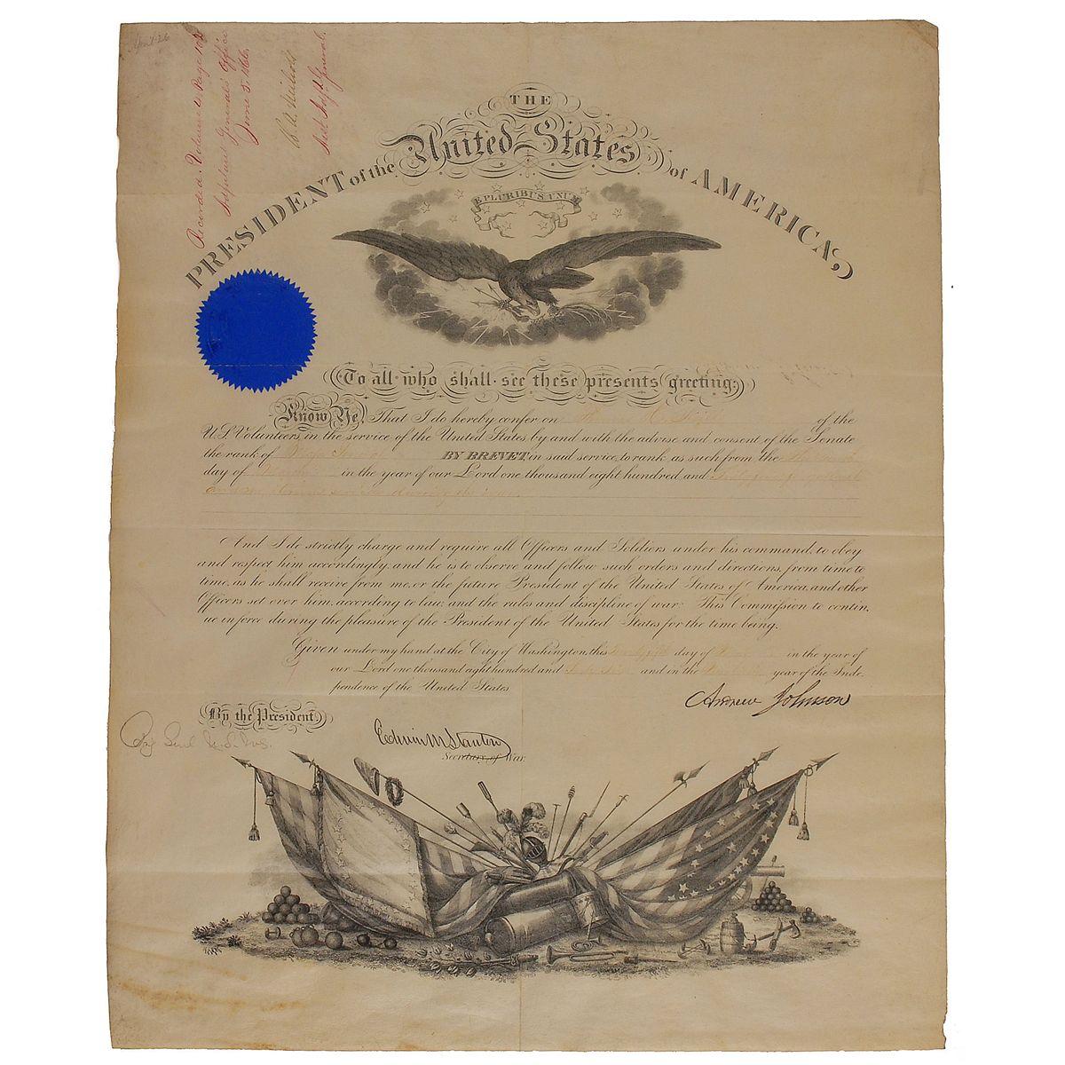 Partly-printed vellum DS, bearing a stamped signature of president Andrew Johnson, one page, 15.5 x 19.5, July 30, 1866. Neill is promoted to “the rank of Brigadier General…for gallant and meritorious service in the field during the war.” Stamped at the bttom and countersigend by Secretary of War Edwin Stanton. The blue seal is crisp and intact. Rolled.