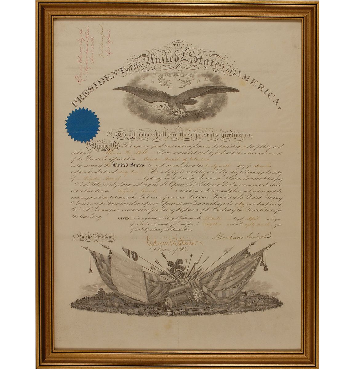 War-dated partly printed vellum DS, signed as President, “Abraham Lincoln,” one page, 14.5 x 19.25, April 15, 1863. Neill’s appointment as Brigadier General of Volunteers, signed at the conclusion by Lincoln and countersigned by Secretary of War Edwin Stanton. Framed to an overall size of 16.5 x 21.25. The blue seal is crisp and intact.