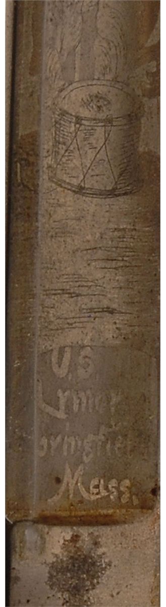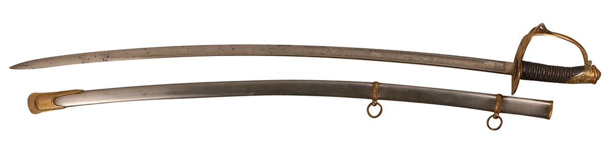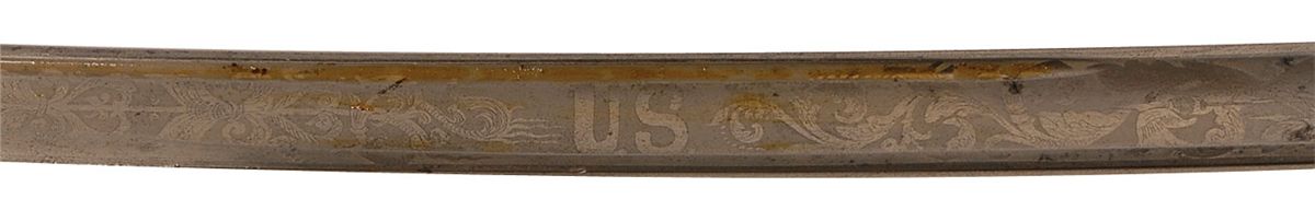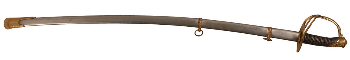 Neill’s U. S. Army Cavalry Saber. Sabre has a 34? blade with etched panels of military motifs on both sides, with “Springfield, Armory, Springfield, Mass” on the ricasso. The blade shows scattered light pitting. The the wire-wrapped shark skin is in fine condition as well as the brass guard. The steel scabbard is also in fine condition, with no dings or nicks.