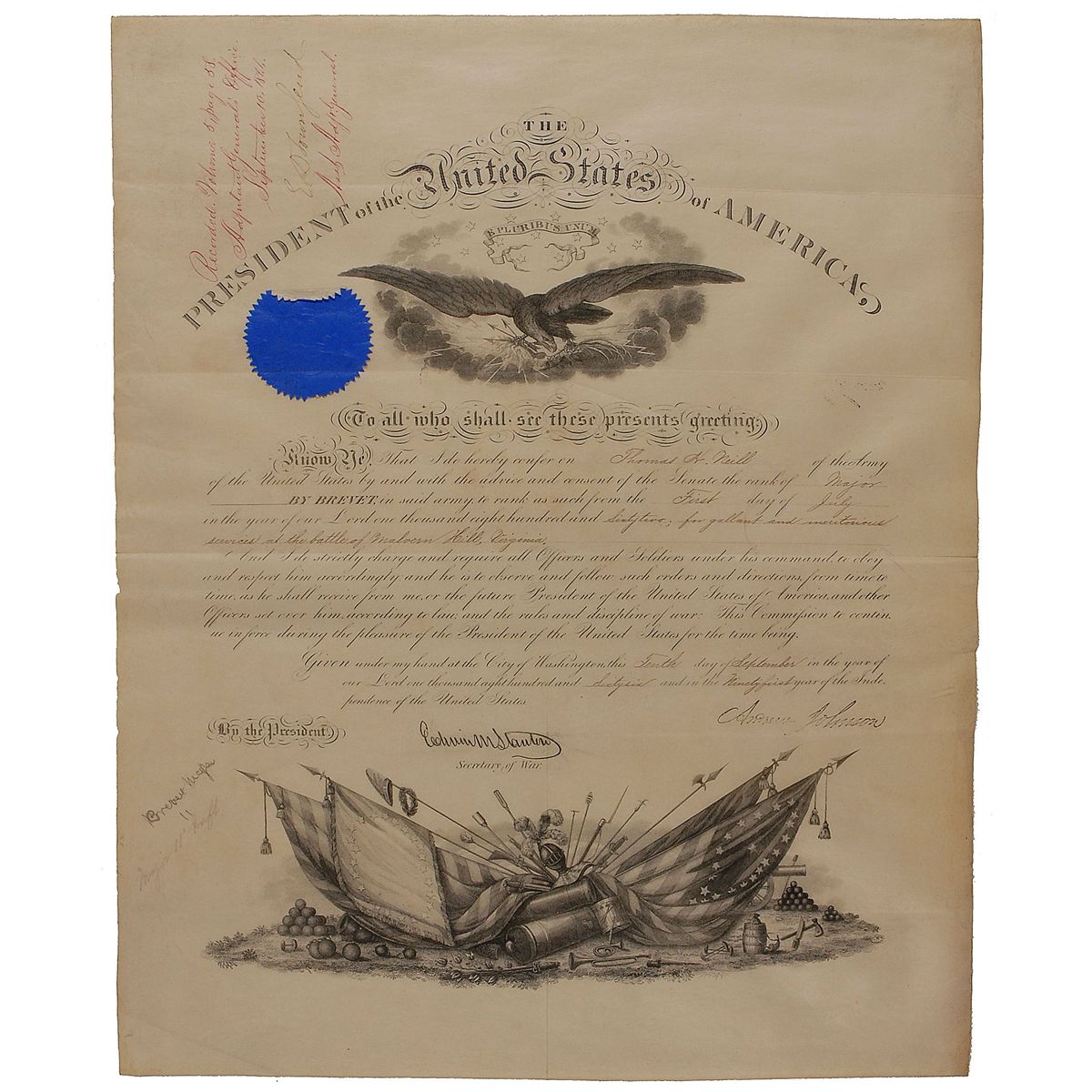 Partly-printed vellum DS, bearing a stamped signature of President Andrew Johnson, one page, 15.5 x 19.25, September 10, 1866, promoting Neill to “the rank of Major by Brevet…for gallant and meritorious services at the battle of Malvern Hill, Virginia. Johnson’s stamp is at the bottom and document is countersigned by Secretary of War Edwin Stanton. The blue seal is slightly worn, but intact. Rolled.