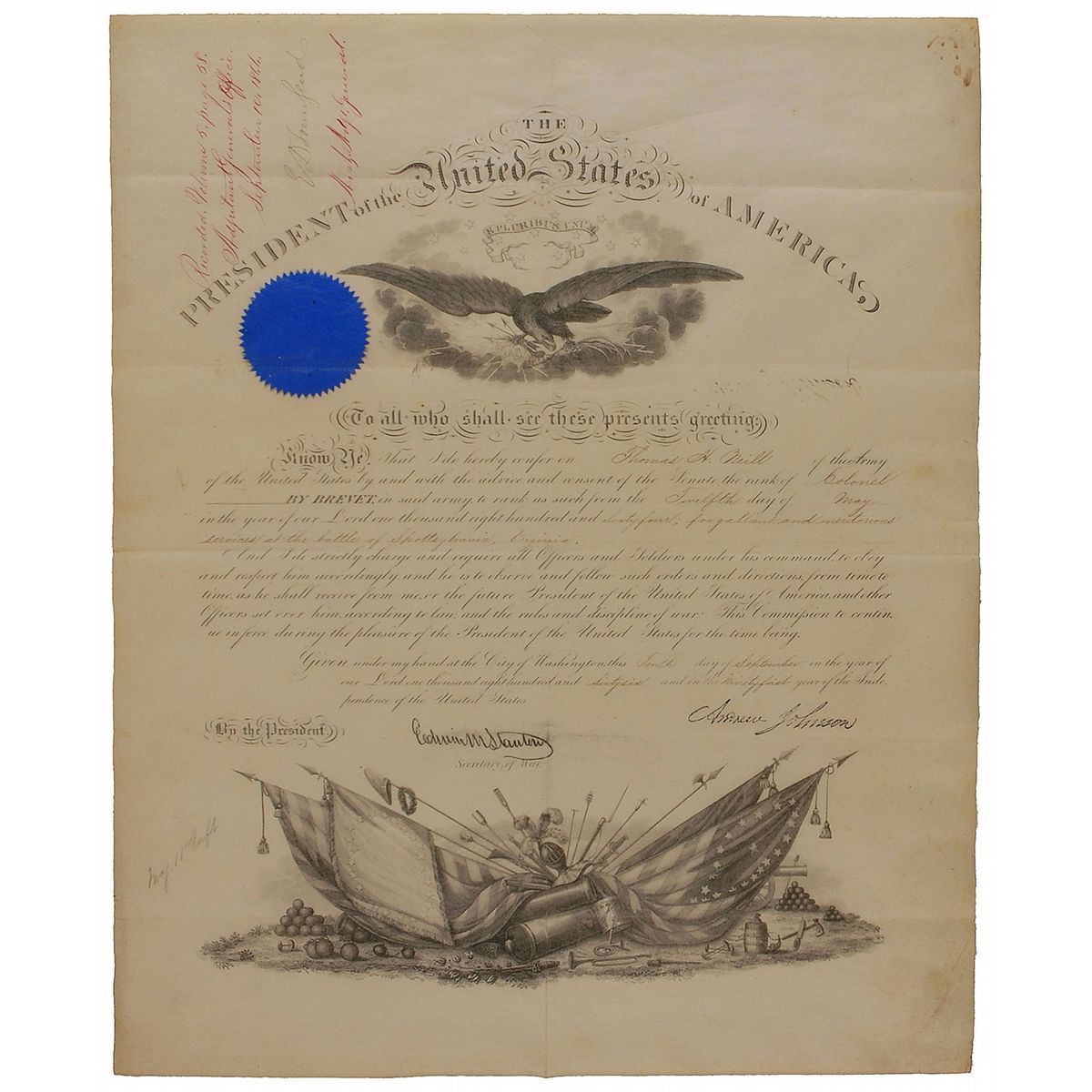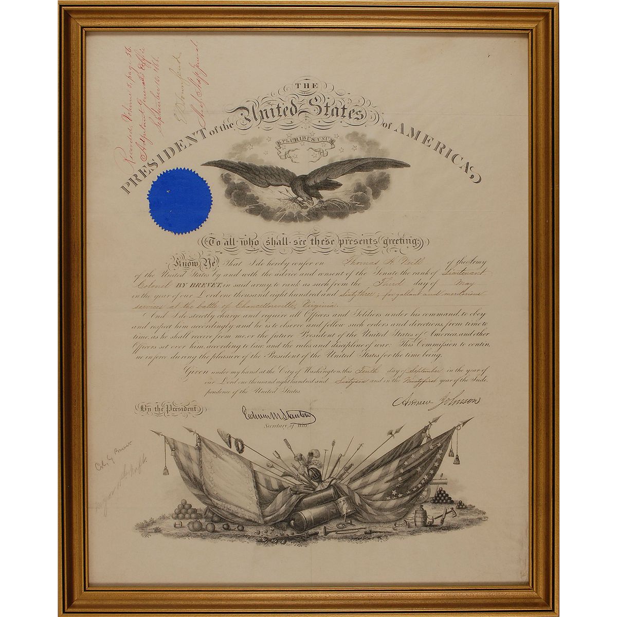 Partly-printed vellum DS, bearing a stamped signature of President Andrew Johnson, one page, 15.5 x 19.25, September 10, 1866, promoting Neill to “the rank of Lieutenant Colonel by Brevet…for gallant and meritorious service at the Battle of Chancellorsville, Virginia.” Johnson’s stamp is at the bottom and documentis countersigned by Secretary of War Edwin Stanton. Framed to an overall size of 17.5 x 21. The blue seal is crisp and intact.