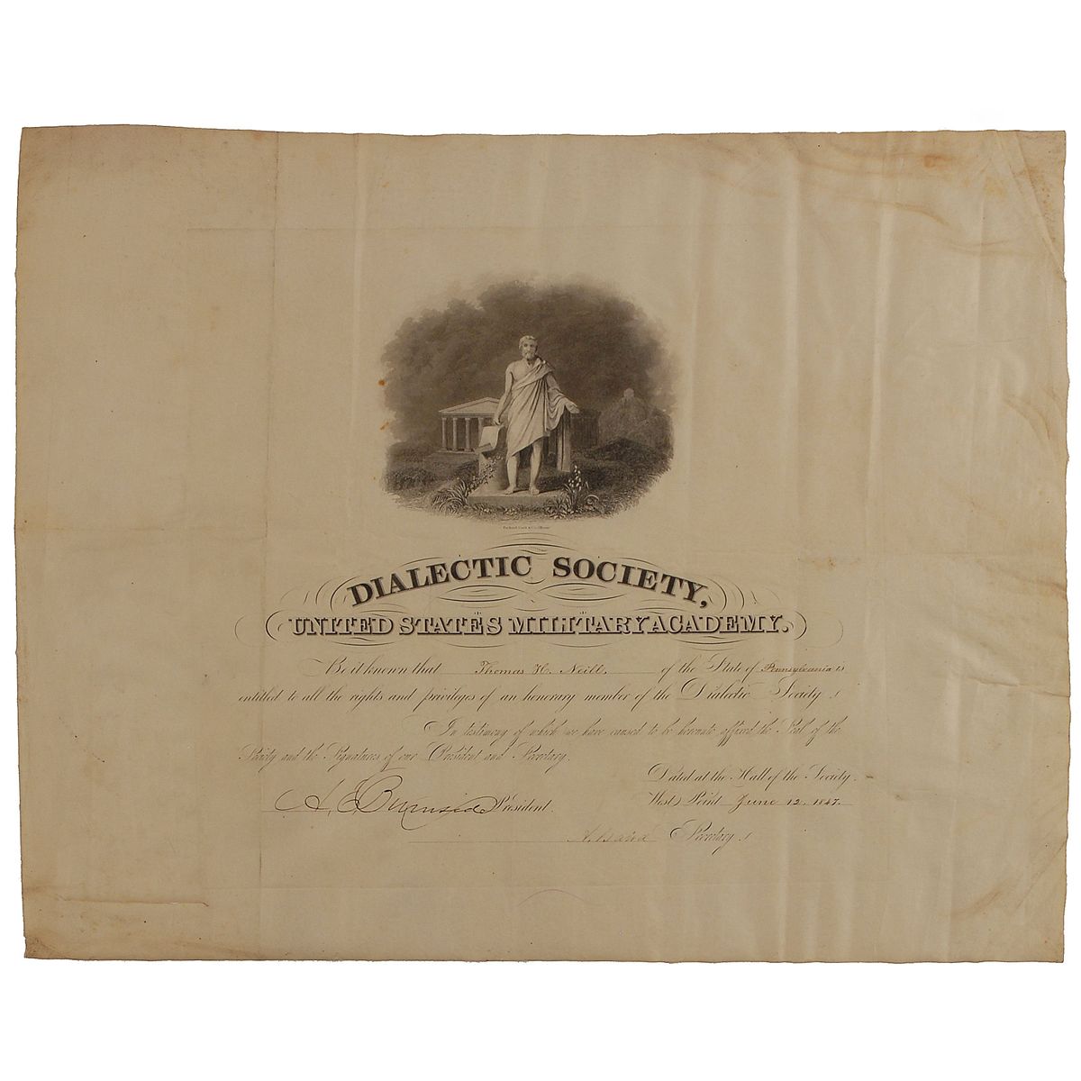 Neill’s membership certificate to the United States Military Academy’s Dialectic Society, one vellum page, 19.25 x 15, June 12, 1847. Certificate states “Thomas H. Neill…is entitled to all the rights and privliedges of an honorary member of the Dialectic Society.” Bottom bears a secretarial signature of the society’s president, Ambrose Burnside. Rolled.