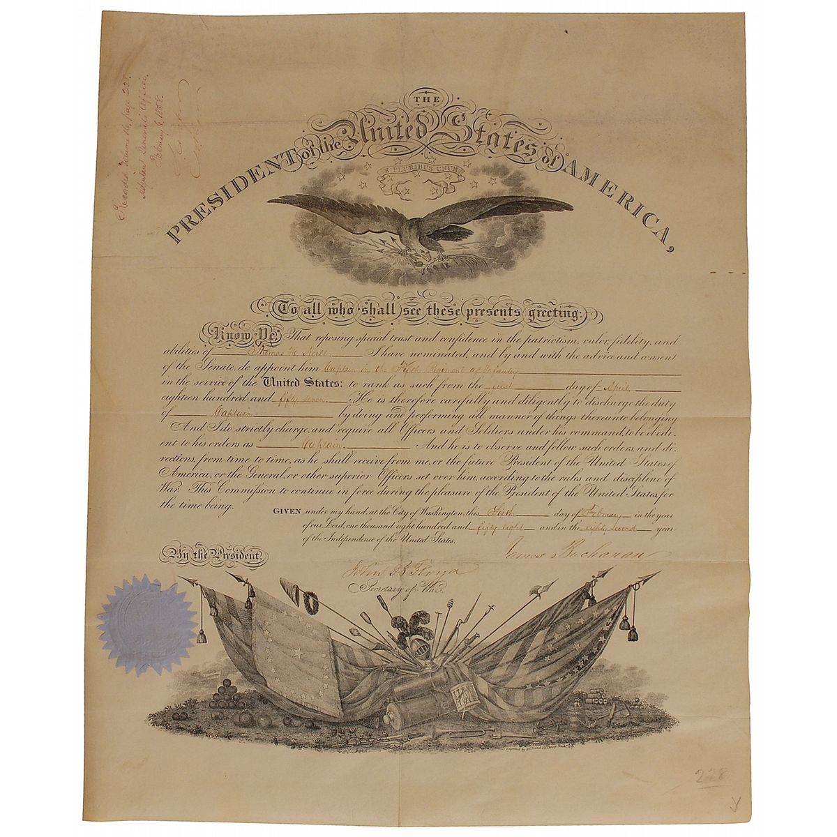 Partly-printed vellum DS, signed as President, “James Buchanan,” one page, 15.75 x 19.5, February 6, 1858. Buchanan appoints Neill a “Captain in the Fifth Regiment of Infantry.” Signed at the conclusion by Buchanan and countersigned by Secretary of War John B. Floyd. The light blue seal is crisp and intact.