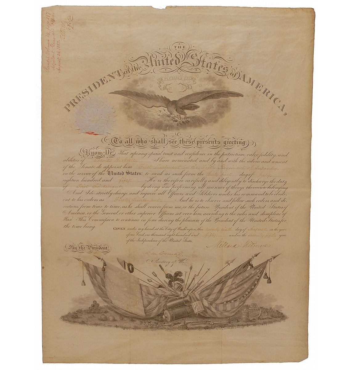 Partly-printed vellum DS, signed as President, “Millard Fillmore,” one page, 14.5 x 19, August 26, 1850. Neill’s appointment to serve as “First Lieutenant in the Fifth Regiment of Infantry,” signed at the conclusion by Fillmore and countersigned by Secretary of War Charles Conrad. The white wafer seal is intact.