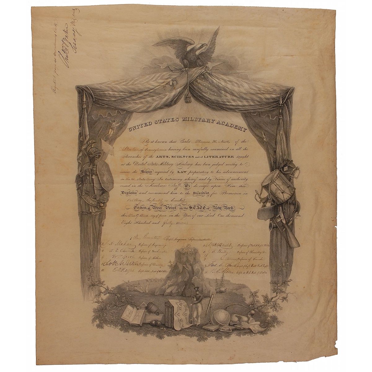 Neill’s diploma from the United States Military Academy at West Point. Ornate engraved degree measures 17.5 x 20.25, is dated June 23, 1847, and states “Be it known that Cadet Thomas H. Neill of the State of Pennsylvania having been carefully examined on all the Branches of the Arts, Sciences, and of Literature taught at the United States Military Academy has been judged worthy to receive the degree required by Law preparatory to his advancement in the U. States Army.” Signed at the conclusion by 11 instructors. Rolled.