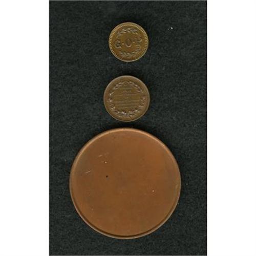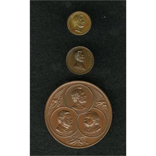 <B>Abraham Lincoln Trio of Medals.</B></I> Three copper medals: a <B>38-mm copper uniface medal </B></I>featuring Lincoln, Grant, and Logan; a similar piece,<B> </B></I>King 411, 16 mm, <B>1866 "Salvator Patriae," </B></I>dies by Wyon, published by the ANS, New York; and a <B>13.5-mm</B></I> <B>GOP minimedal, </B></I>unlisted. <BR><BR><b>Shipping:</b> Coins & Currency (<a target="_blank" href="http://www.heritageauctions.com/common/shipping.php">view shipping information</a>)