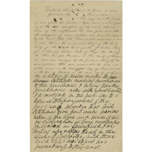 <B>Abraham Lincoln. Unsigned Autograph Document.</B></I> No place or date (Sangamon Co., Ill., ca November 1840), one-half page, folio. A court decree (half in Lincoln's hand, the balance in an unknown hand) granting the petition of Sarah Brown, guardian, to sell some real estate "<I>at public vendue on the on the twenty-fifth day of December next in the town of Rochester…</B></I>" She is ordered to advertise the sale in "some newspaper published in Springfield & by posting up notices…in…Rochester…" From the Henry E. Luhrs Collection. Accompanied by LOA from PSA/DNA.