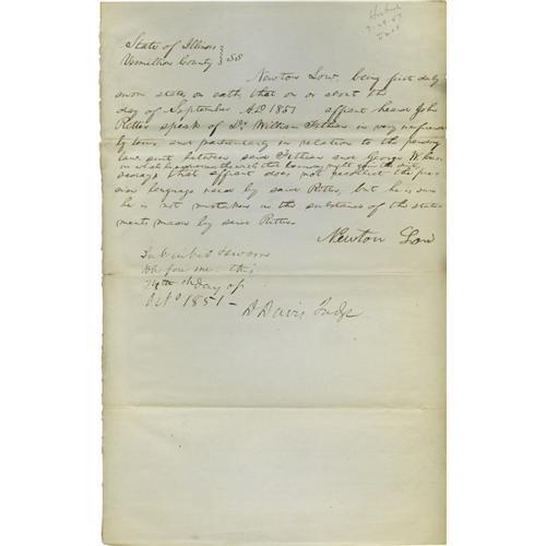 <B>Abraham Lincoln. Unsigned Autograph Document.</B></I> Vermilion Co. (Ill.), Oct. 24, 1851, one-half page, folio. A deposition prepared for and signed by Newton Low, which has been witnessed by the dated signature of <B>David Davis</B></I> (as "D Davis Judge"). Low swears on oath that sometime in September he <I>"heard John Ritter speak of Dr. William Fithian in very unfriendly terms, and particularly in relation to the pending law suit between…Fithian and George W. Casseday in which he expressed the wish that Casseday might gain the suit…" Low states that he "does not recollect the precise language used by…Ritter, but he is sure he is not mistaken in the substance of the statements…"</B></I> Slightly frayed margins; margins and folds reinforced on verso, which is blank except for a docket. SEE PRECEDING LOTS From the Henry E. Luhrs Collection.