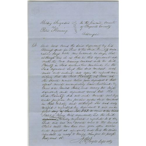 <B>Abraham Lincoln. Unsigned Autograph Document.</B></I> Vermilion Co., Ill., 3 June 1853, three and one-quarter pages, folio. A long, involved affidavit by Daniel Sturm, principal defendant in a lawsuit brought by John S. Graham, guardian of the minors Mary J., Marena E., and Sarah M. French. Sturm recalls coming to Danville, Ill. from his residence in Indiana to see his attorney, W.H. Lamon, and declares that they could not procure a copy of the bill in Graham's suit at either the offices of the court clerk or the plaintiff's attorney, O.L. Davis. Sturm "<I>remained in Danville over night, and in the morning again saw said Lamon, who again told him that said bill could not be found, upon which affiant returned to Indiana…[A] week or two afterwards affiant wrote to Mr. Davis, enquiring whether said bill had been found, but got no answer…</B></I>" Sturm and the plaintiff subsequently "<I>agreed upon terms of adjustment, except that complainant reserved to himself to go to Mr. Davis and ascertain whether he would approve of said adjustment; at the same time promising…he would return and inform affiant of the result, and also…of the true time of said term of court, about which there then was some question in the minds of both…</B></I>" Graham did not however return, and near the end of the court term Sturm <I>"was astounded by the information that the court had been in session that week…"</B></I> A decree by default having been entered against him, Sturm does not object to the allegations in Graham's bill nor the proof taken, but says "<I>that great injustice will be done him in the final decree, unless he be allowed to alledge and prove some matters, in the nature of set-off…[I]n the account against him he is charged with the rents, issues and profits [of] a certain farm in Indiana belonging to said minors...[W]hen he first bought said farm for said minors…he found it in no condition to be profitably used and enjoyed, and…to make it productive, he did throughout the years of 1845 up to the year 1850 make valuable and lasting improvements…consisting in part of the finishing of a dwelling house, the building of a smoke house & two stables, the planting of an apple orchard of eighteen trees, now bearing, and…clearing in the timber & fencing…fourteen acres and a half of land, and breaking the most of it…</B></I>" For this, as well as for real estate taxes, expenses, and for nearly six and a half years of "<I>custody and care</B></I>" of the minors, furnishing their "<I>necessary food, clothing, lodging, and schooling,</B></I>" Sturm seeks a set-off of more than $1600. If "<I>allowed to make these allegations & proof of them, he will do so upon the terms, that he will dispute none of the proof of the complainant already in; that complainant make any additional proof in his power; that this affidavit stand for his answer in the cause; and that he will now produce his proofs and ask no continuance…He…has been guilty of no bad faith, in not answering sooner…but…has, in all things, intended to do full justice, with reasonable diligence as to time.</B></I>" Sturm boldly signs at conclusion. Extensive glassine repairs to fold breaks and tenderness; small marginal chip on last page. A long, interesting Lincoln legal, with over 700 words in his hand. $3,800-4,500 From the Henry E. Luhrs Collection.