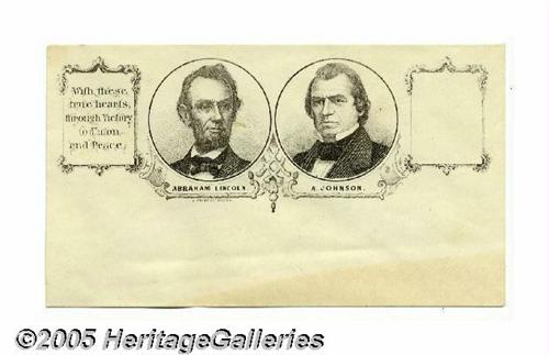 <B>Abraham Lincoln and Andrew Johnson Jugate Cover</B></I> The complete cover. We occasionally see this graphic removed from a cover and sold as a separate panel on its own. This is the classic jugate cover, intact and clean, "With these hearts, through Victory to Union and Peace." This is one of the earliest designs to include a printed frame for the placement of a stamp. Lot:258