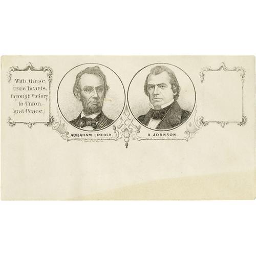 <B>Abraham Lincoln and Andrew Johnson Jugate Cover</B></I> The complete cover. We occasionally see this graphic removed from a cover and sold as a separate panel on its own. This is the classic jugate cover from the 1864 campaign, intact and clean. Left of the portraits is the slogan: "With these hearts, through Victory to Union and Peace." This is also one of the earliest designs to include a printed frame for the placement of a stamp.<BR><BR><b>Shipping:</b> Miscellaneous Collectibles, Smal (<a target="_blank" href="http://www.heritageauctions.com/common/shipping.php">view shipping information</a>)