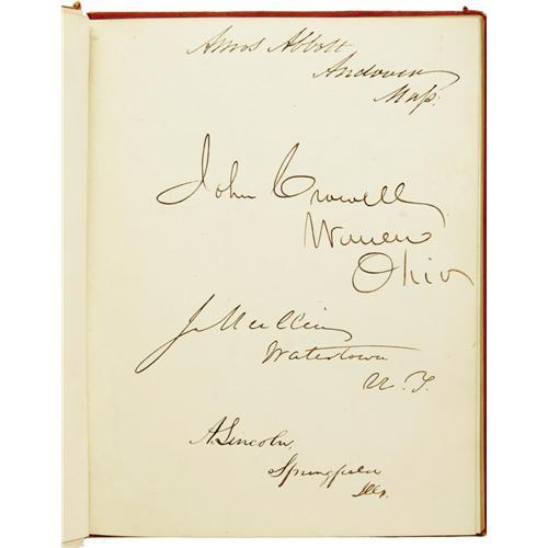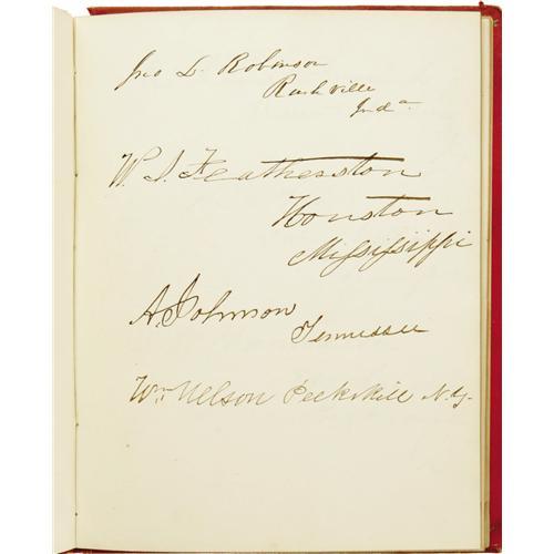 <B>His Only Term in Congress -- Abraham Lincoln and House Colleagues Including Andrew Johnson.</B></I> A rare combination of signatures <I>"A. Lincoln Springfield, Ills."</B></I> and <I>"A. Johnson, Tennessee",</B></I> both as U. S. Congressmen in a 6.25" x 7.75", 56 leaf (approx.) autograph album, Washington, 1848 , together with what appears to be the signatures of most of the Thirtieth United States Congress. A particularly rare piece considering that Abraham Lincoln only served one term in Congress when he defeated preacher Peter Cartwright in the Seventh District of Illinois... winning his seat despite a whispering campaign accusing Lincoln of atheism. Lincoln, the only Whig ever elected to Congress from Illinois, served a mere one term before returning to his law practice in Illinois. During his brief tenure, Lincoln was quite outspoken in opposition to the Mexican War. He would not hold another federal office until being elected President in 1860. Andrew Johnson served in Congress 1843-52 returning to Washington as a Senator in 1857. The two would, of course, be running mates in the Election of 1864. Other signatures in the album include future Confederate Vice President <B>Alexander Stephens,</B></I> noted reformer and educator <B>Horace Mann,</B></I> together with <B>David Wilmot, Robert Toombs, T. Butler King,</B></I> and <B>R. Barnwell Rhett.</B></I> The album is bound in red tooled leather with a gilt motif of a maiden spreading flowers with gilt page edges. Several pages loose, but mostly very clean with light scattered foxing to a few, boards rubbed at top and bottom, else fine condition. An exceptional rarity.<BR><BR><b>Shipping:</b> Books & Catalogs (<a target="_blank" href="http://www.heritageauctions.com/common/shipping.php">view shipping information</a>) <BR><BR><B>Important notice:</