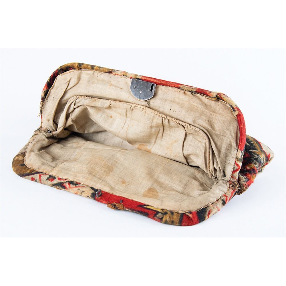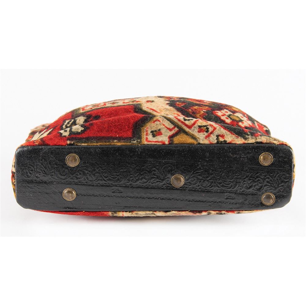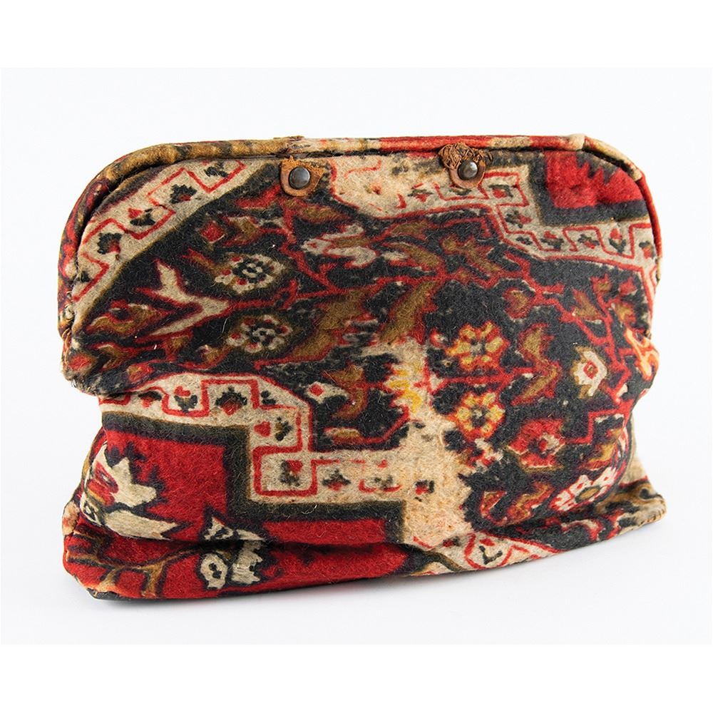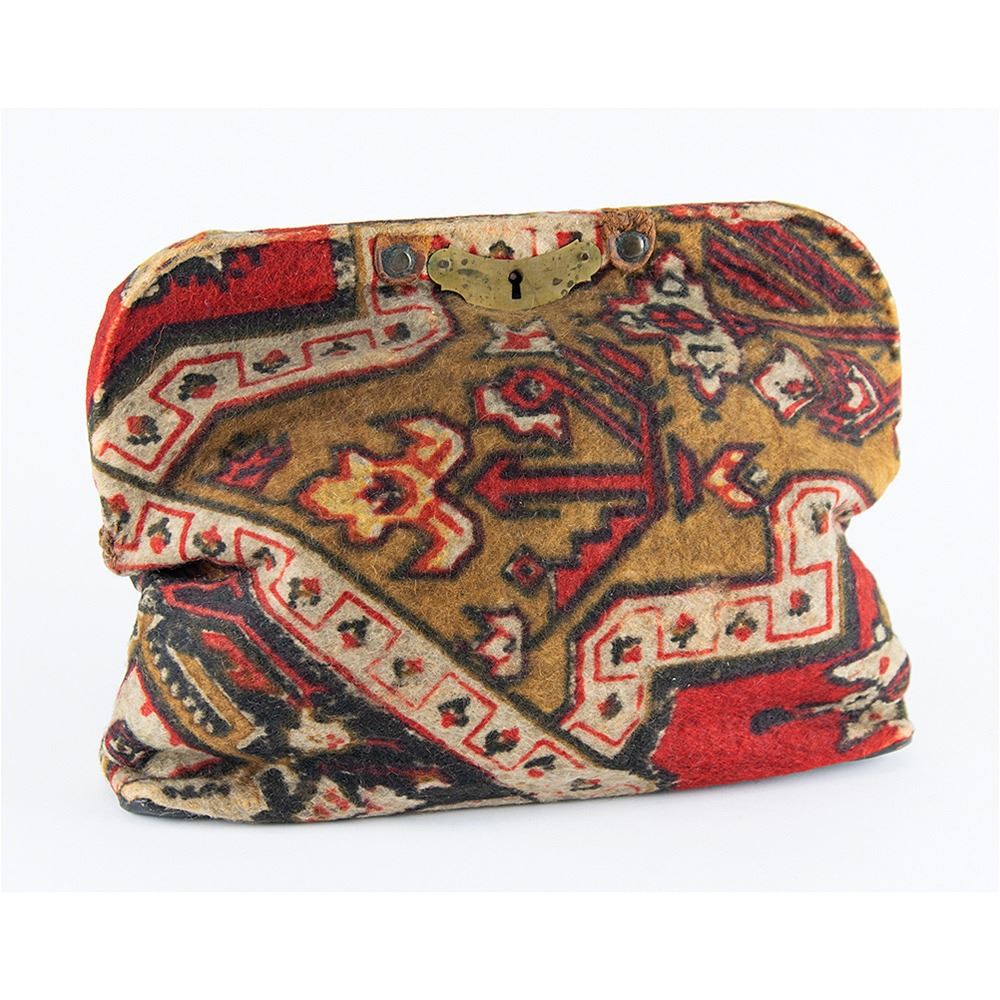 The carpet bag, measuring approximately 15Àù x 11Àù, features an ornate, colorful geometric pattern in red, gray, black, and gold, with a large brass lockplate on the front (the key has been lost). The top of the bag retains the four brass studs used to secure the bag's dark brown leather handles; both have become cleanly detached from age, but are included with the bag. The interior boasts a cotton lining hand-stitched around metal casements, with a divider at center. The bottom boasts five brass studs.