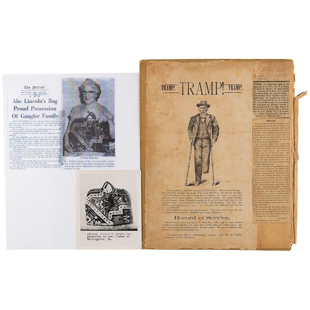 The story of President Lincoln's meeting with Fisher, and the gift of this carpet bag, is told in "Selinsgrove's Centennial Souvenir Book," published in 1953. The piece features an image of this carpet bag, a portrait of Fisher, and traces the bag's lineage. In part: "While Levi Fisher was recovering from his wounds in an army hospital, it happened that President Lincoln made one of his accustomed visits to the hospital. He found Fisher on his cot greatly depressed in spirit and weeping about his personal state of affairs…His right leg was gone, he was housed in an army hospital surrounded by sick, wounded, the dying and the dead…Levi Fisher realized that he would be discharged from the army before long, but he lacked adequate space in his baggage for all the things he wanted to take along with him. And he must have so told the President. The President forthwith emptied his own carpetbag of his personal belongings, and handed the empty bag to him with words probably like these—'You take it, your need for it is greater than mine'…Upon his return home, he soon began to need a shoe for his remaining foot. He went to J. Conrad Fetter, a shoemaker who lived near the village of Kantz in Penn Township. He acknowledged to Mr. Fetter that he did not have the money to pay for the shoe, but expressed his willingness to give him the carpetbag that President Lincoln had given him. Fetter agreed to the exchange. The carpetbag became a greatly-prized family heirloom. Upon the death of Conrad Fetter in 1901, the carpetbag passed into the possession of his son-in-law, Peter Sechrist, and upon his death in 1920, the carpetbag became the property of his son, Squire Allen Sechrist, and it has remained in his possession to this day."