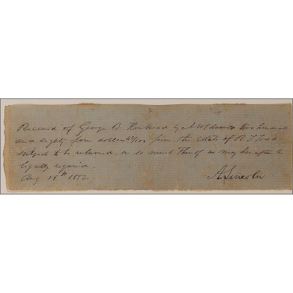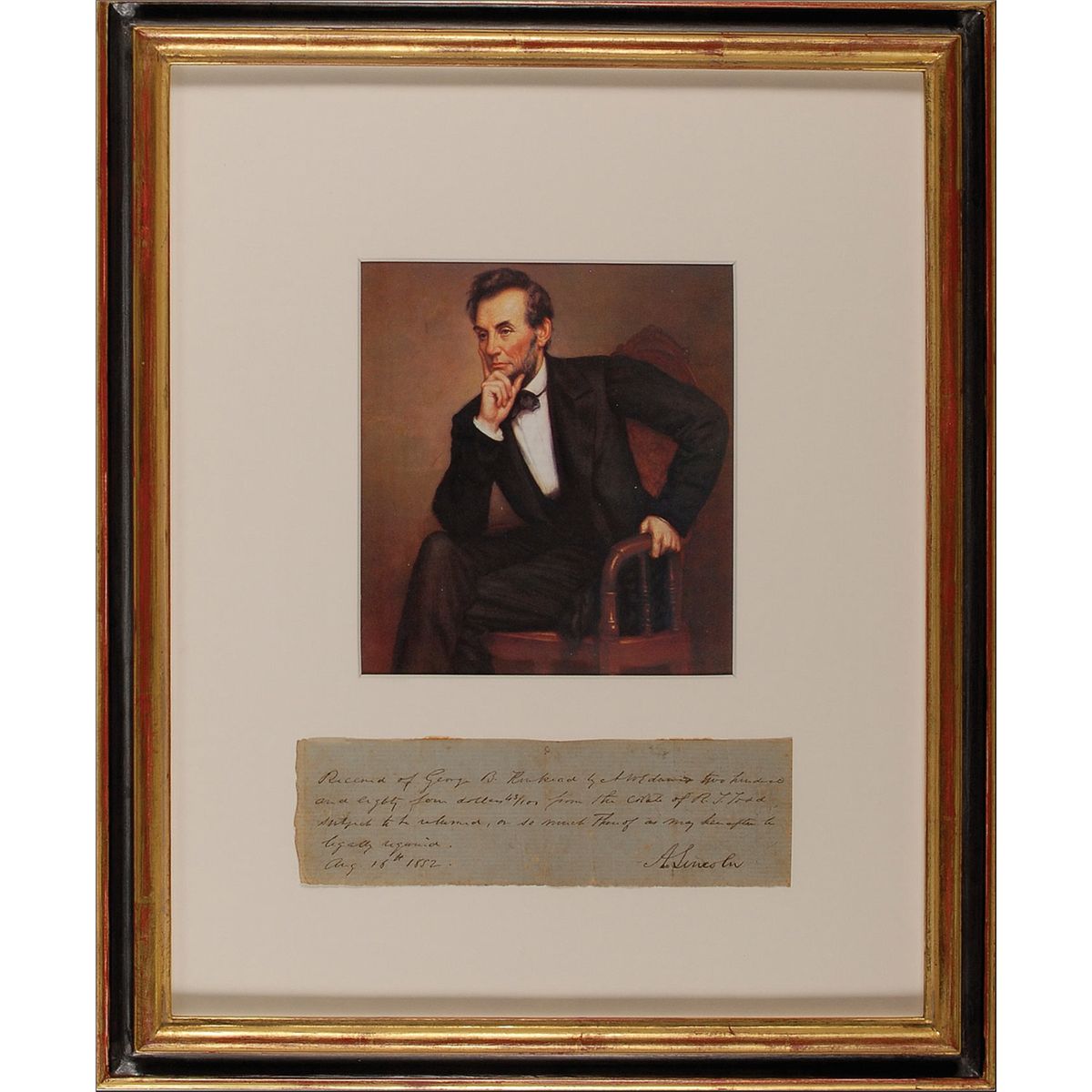 ADS, signed “A. Lincoln,” one page, 7.5 x 2.25, August 18, 1852. Document referring to the estate of his father-in-law, Robert S. Todd. In full: “Received of George B. Kinkead by N[inien] W. Edwards two hundred and eighty four dollars 43/100 from the estate of R. S. Todd subject to be released, or so much thereof as may hereafter be legally required.” Framed with a color portrait of Lincoln, to an overall size of 14 x 17. In very good condition, with central horizontal and vertical fold, a few creases, and some scattered light toning and foxing.