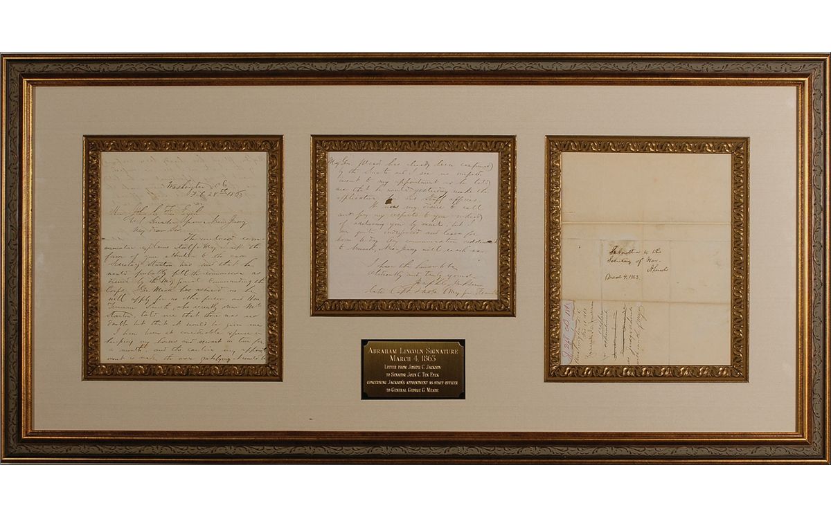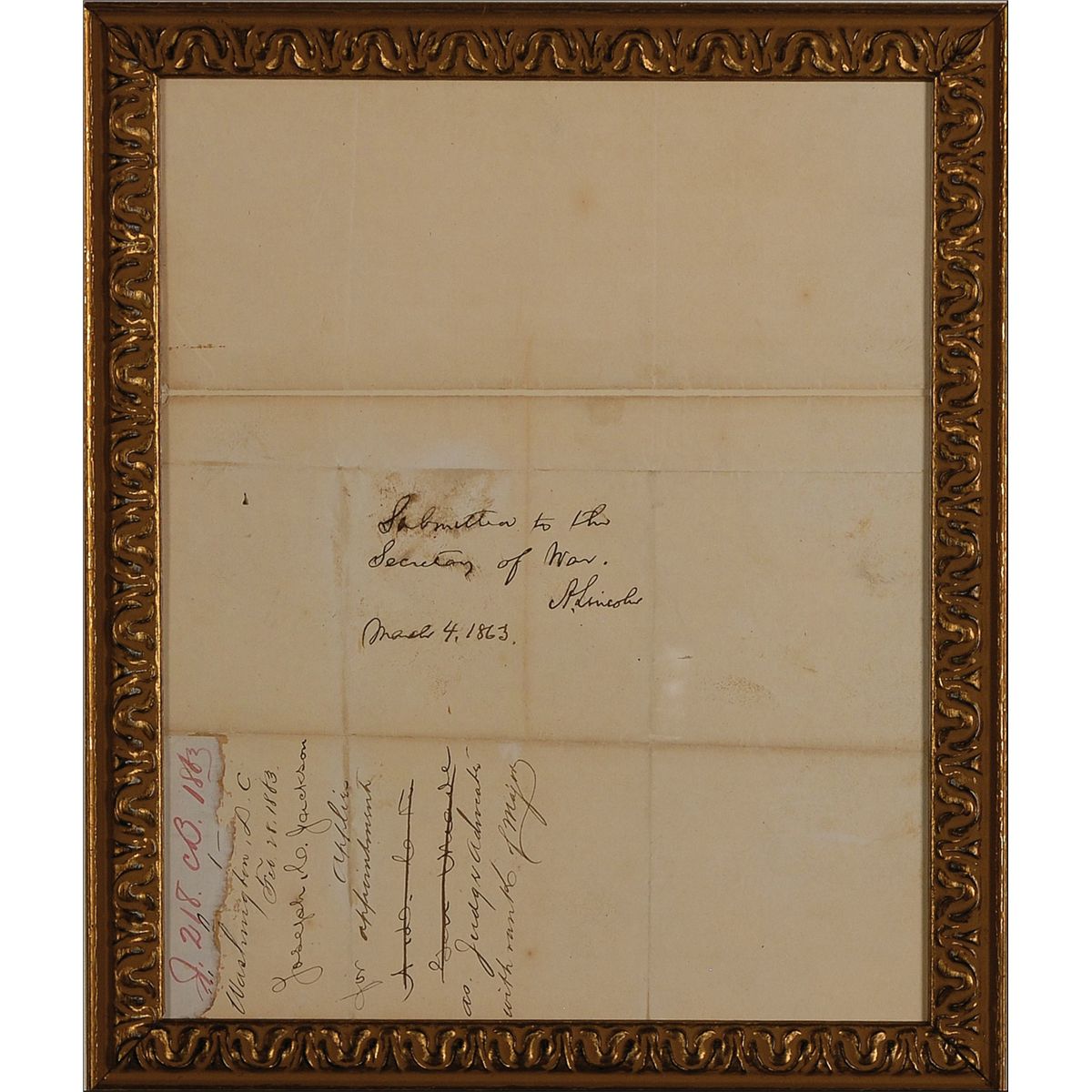 War-dated handwritten endorsement, signed “A. Lincoln,” dated March 4, 1863, on the reverse of the second page of a letter to Senator John C. Ten Eyck from Joseph Jackson. Jackson writes, in full: “The enclosed communication explains itself. May I ask the favor of your attention to the case. Secretary Stanton has said that he would probably fill the commission as desired by the Maj. General commanding the Corps. Gen Meade has assured me he will apply for no other person, and Hon. Truman Smith, who recently saw Mr. Stanton, told me that there was no doubt but that it would be given to me. I have been at considerable expense keeping my horses and servants in town for a month, and the earlier my appointment is made the more gratifying it would be. Maj. Gen. Meade has already been confirmed by the Senate, and I see no impediment to my appointment as he told me that he would yesterday make the application for his Staff officers. It was my desire to call and pay my respects to you instead of advising you by mail, but I am quite indisposed and leave for home to-day. Any communication addressed to Newark, New Jersey will reach me.” Endorsed on the reverse of the second integral page, “Submitted to the Secretary of War. A. Lincoln.” Nicely cloth matted and framed with the front of the letter, a copy of the reverse of the first page of letter, and a small plaque, to an overall size of 37.5 x 18.5. Several fingerprint brushes to endorsement and signature, complete separation along a horizontal fold to both pages, scattered toning and soiling, and a period replacement to a small area of paper loss to lower left of endorsed page, otherwise very good condition. Accompanied by a photocopy of a conservation treatment report from the Abraham Lincoln Presidential Library.