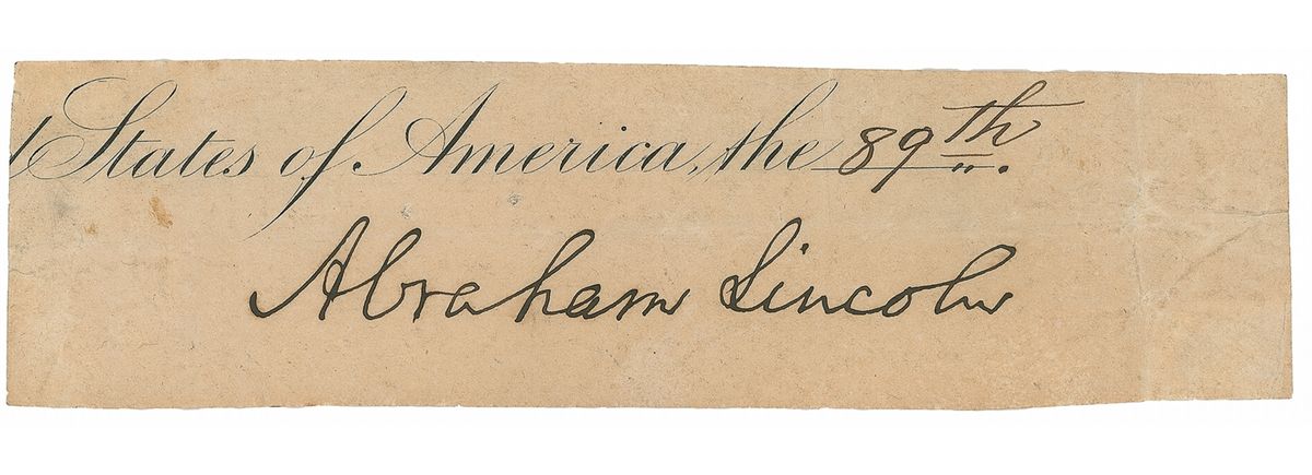 Ink signature, as president, “Abraham Lincoln,” on an off-white 4.75 x 1.25 slip clipped from the closing of a document. In very good condition, with intersecting folds, one lightly affecting the tops of a few letters of signature and some mild toning and wrinkling. Lincoln’s signature is quite bold and measures an impressive 2.75? long.